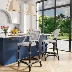 Designer’S Edge Tobias Blue & White Rattan 24 Inch Blue Barstool