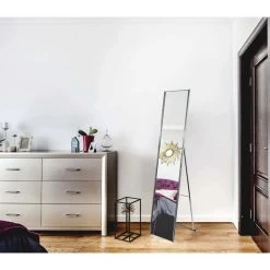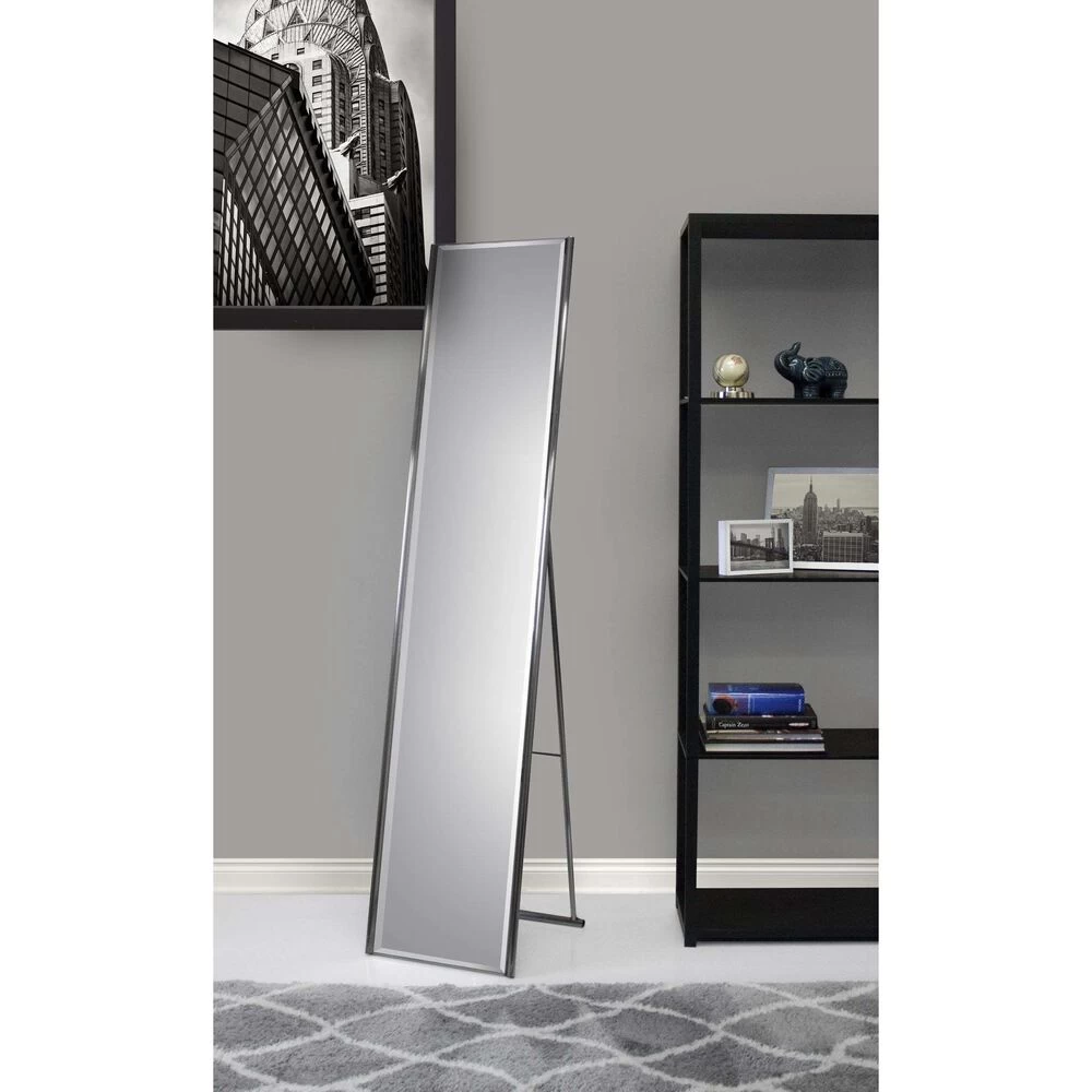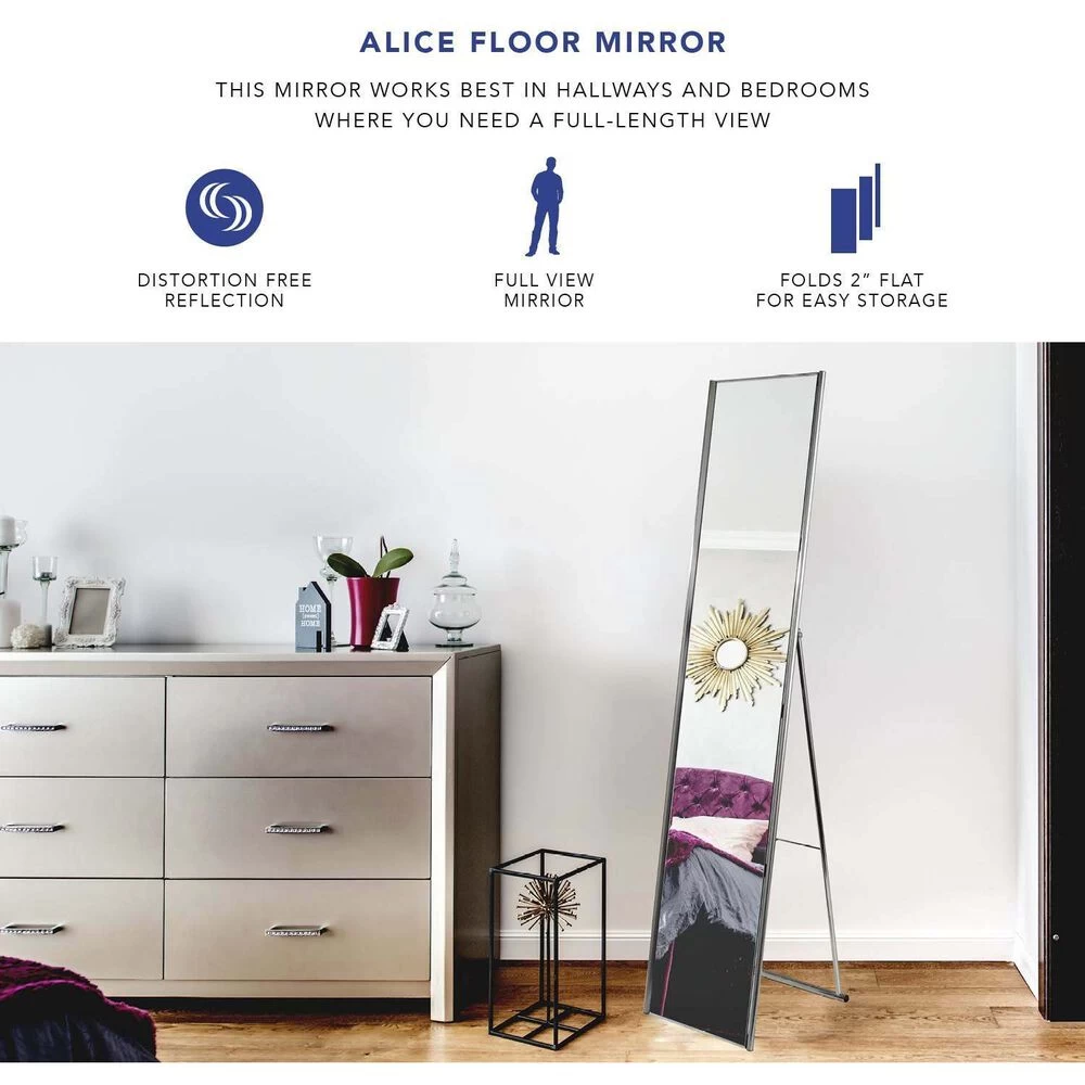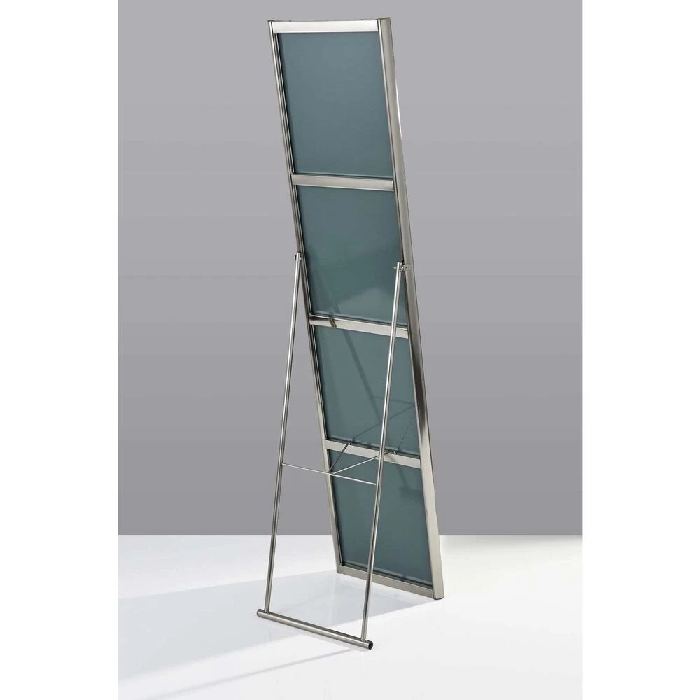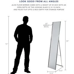 Folding stand-up-floor mirror has a powder coated champagne steel finish. Quarter inch bevel trims the left and right side of the mirror, whose overall width is 11.25″. Overall size: 13.5′ Width, 59″ Height, open depth is 14.5″. Folds flat to 2″ Depth for storage