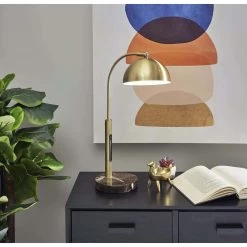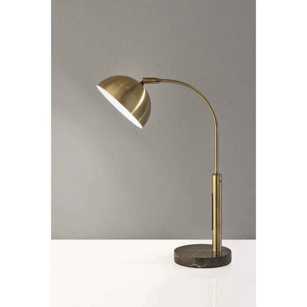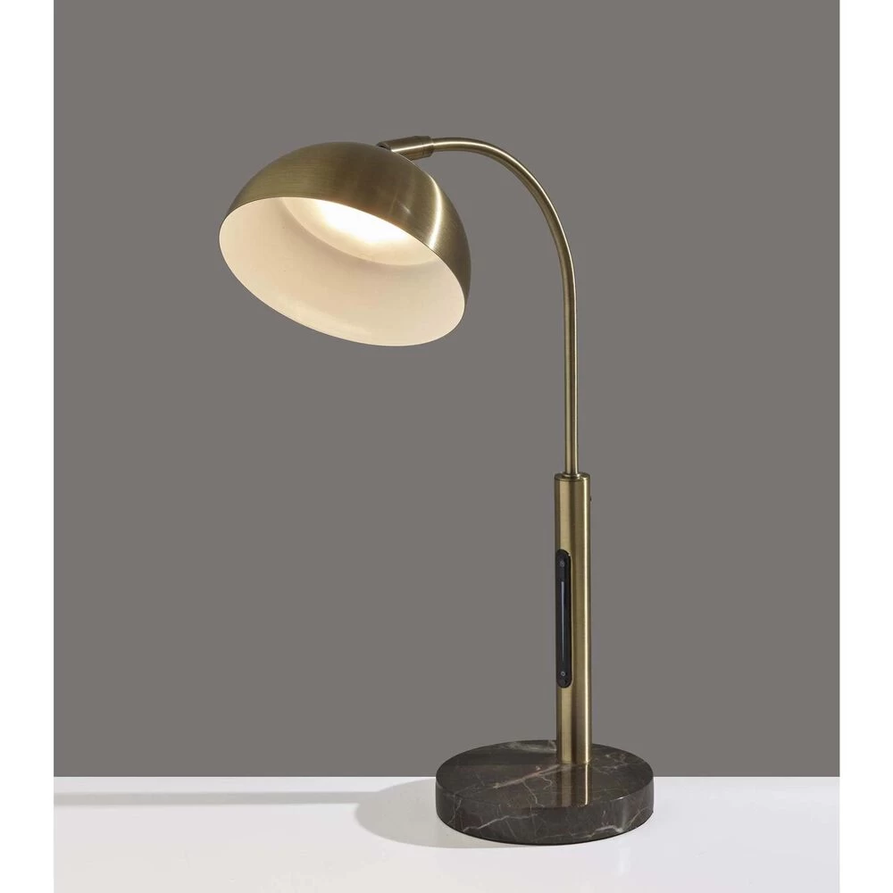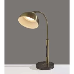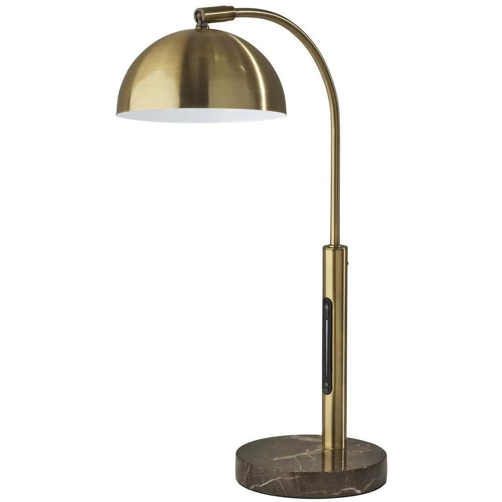 Displaying a modern silhouette and elegant blend of materials, the Bolton LED desk lamp adds functional task lighting to your space. An antique brass pole and matching arcing stem are anchored securely by a 6″ diameter round brown marble base. Topping the stem is a dome-shaped antique brass shade with an articulation point, allowing you to direct the light wherever it’s needed. A convenient touch switch located on the pole gives you full control of the lighting brightness and color temperature at the touch of a finger, while the integrated 6W LED light is softened by a frosted diffuser. Complete your décor with the coordinating Bolton LED floor Lamp, arc lamp, and 3-arm arc lamp.