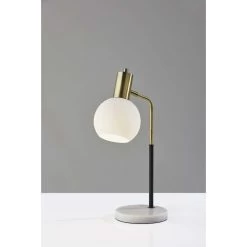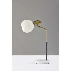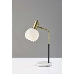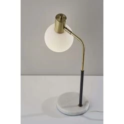 Classic styling meets industrial chic in the 20.5″ tall Corbin desk lamp. The white frosted glass shade is globe shaped and attached to an adjustable head that pivots up or down, allowing you to direct the light wherever you need it. With a mixture of black and antique brass finishes, as well as a luxurious round white marble base, this desk lamp is the perfect complement to any décor. Operated by a rotary switch located on the shade to easily turn it on or off, the Corbin desk lamp powers a 40W Type A bulb (not included) for an ideal level of brightness and features a 5′ clear cord.