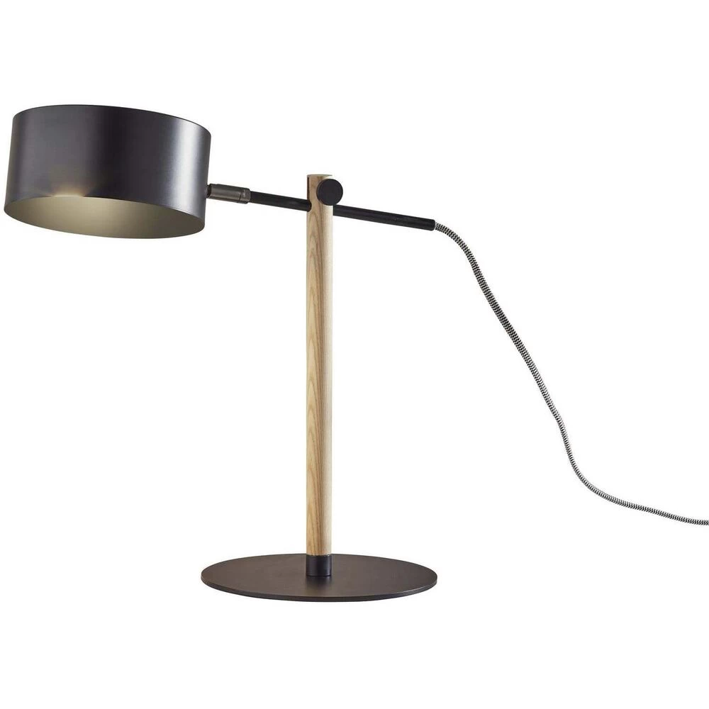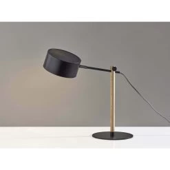 The 19″ tall Dylan desk lamp brings a blend of natural and metal materials and a unique silhouette that complement contemporary, mid-century modern, or modern chic décor. The lamp features a thin, 9″ diameter black metal base supporting a natural China oak stem. Topping the lamp is a large round black metal shade with a matching mesh top that can be rotated to direct the light from a 100W bulb (not included) wherever it’s needed. The lamp is powered by a 5′ cord covered in black and white fabric. Complete your décor with the coordinating tall Dylan floor lamp.