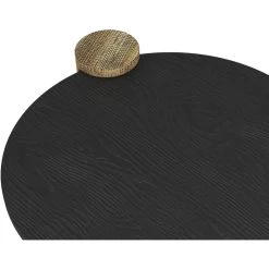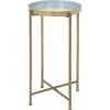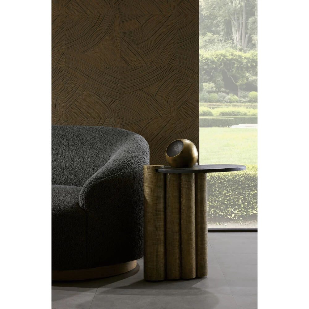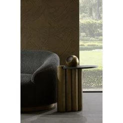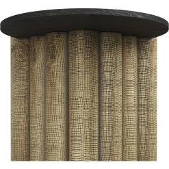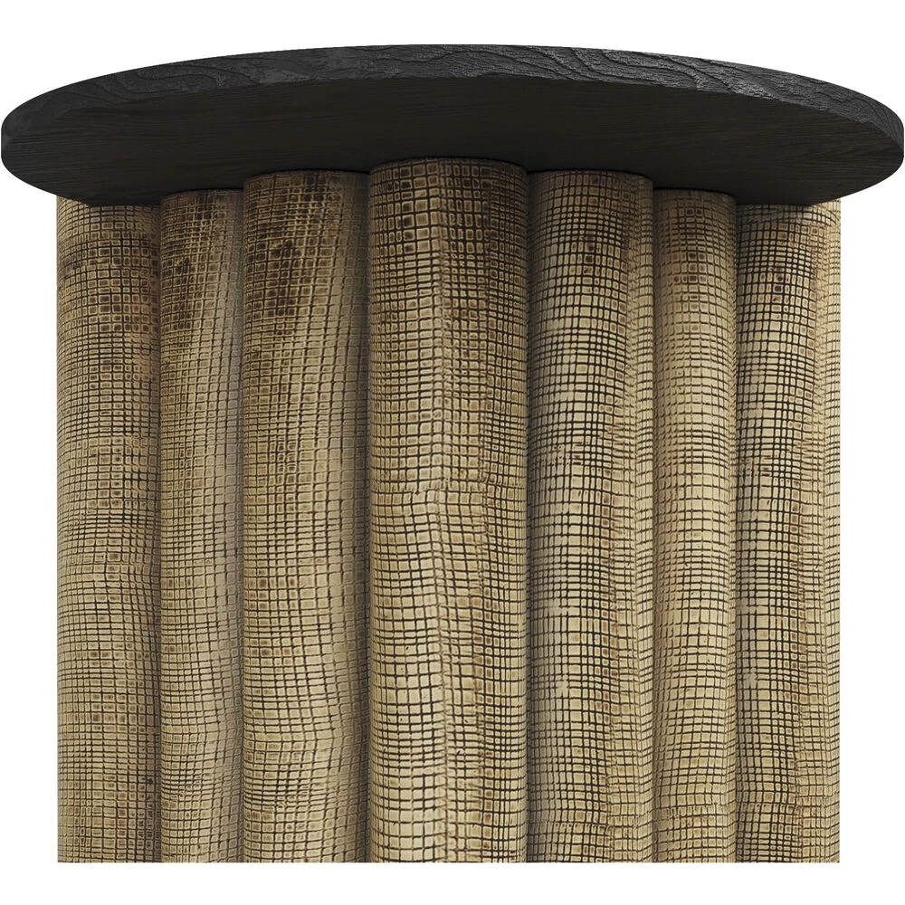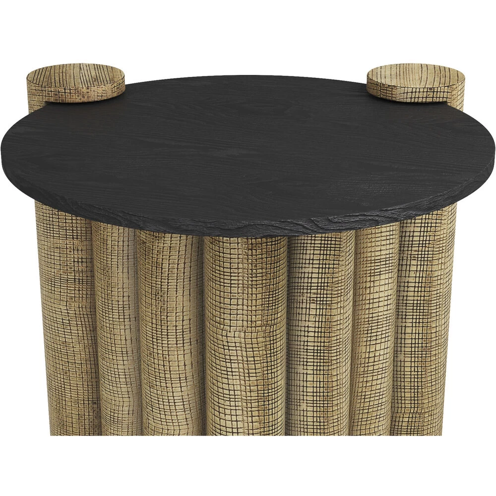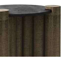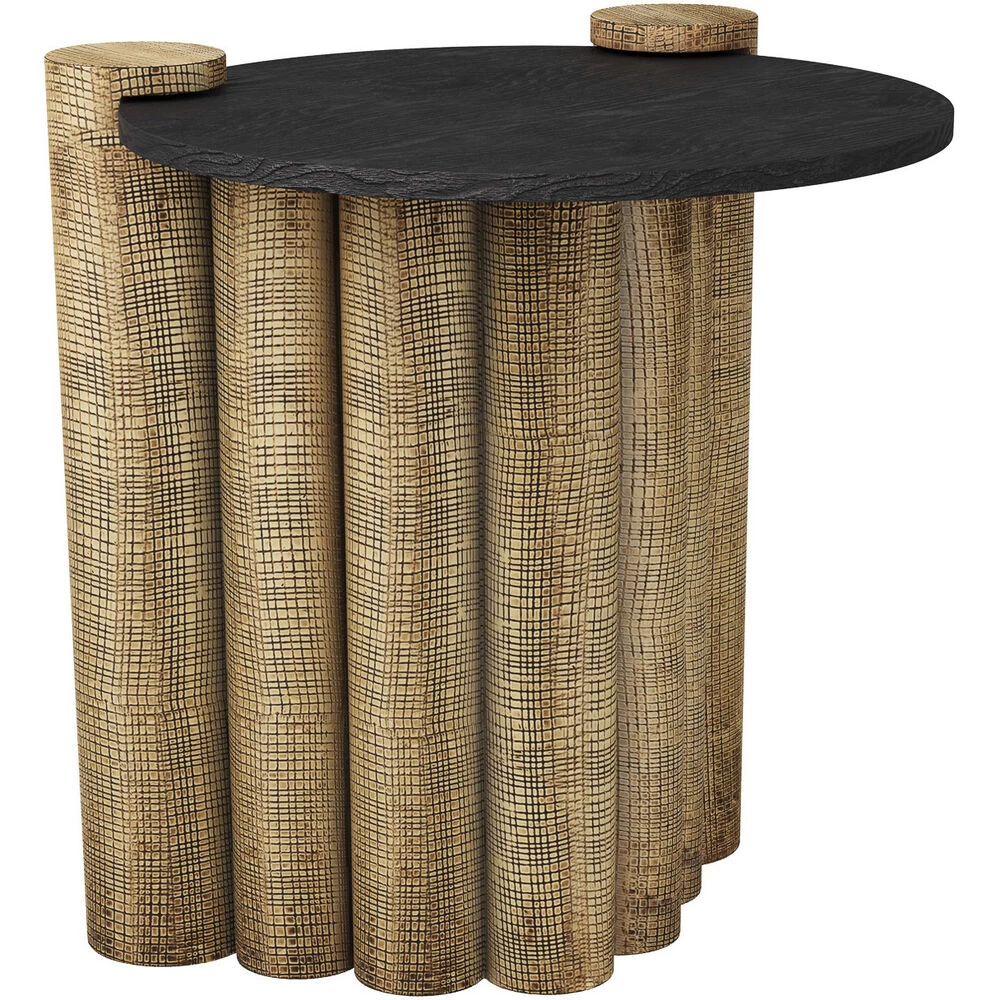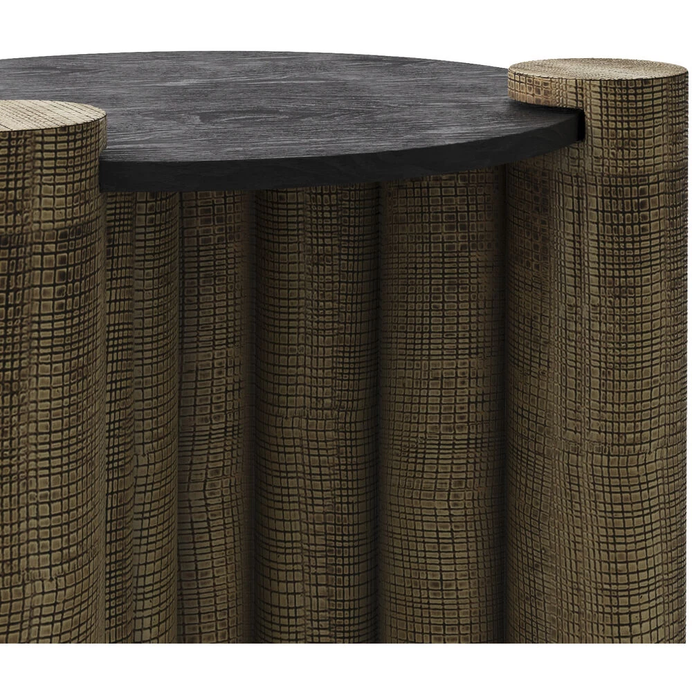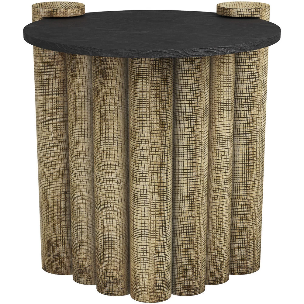 Mixed materials lend a cool contrast to a contemporary end table. A circular top of ebony-finished mango wood balances on a quartet of antique brass clad legs. Crisscrossed with a hatchwork texture for visual interest.?Cladding will vary.