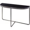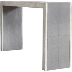 With Modern Elements, This Transitional Console Features Stitched Panels Of Light Gray Faux Shagreen, Paired With A Contrasting Wood Finish In A Aged White With Gray Distressed Details.