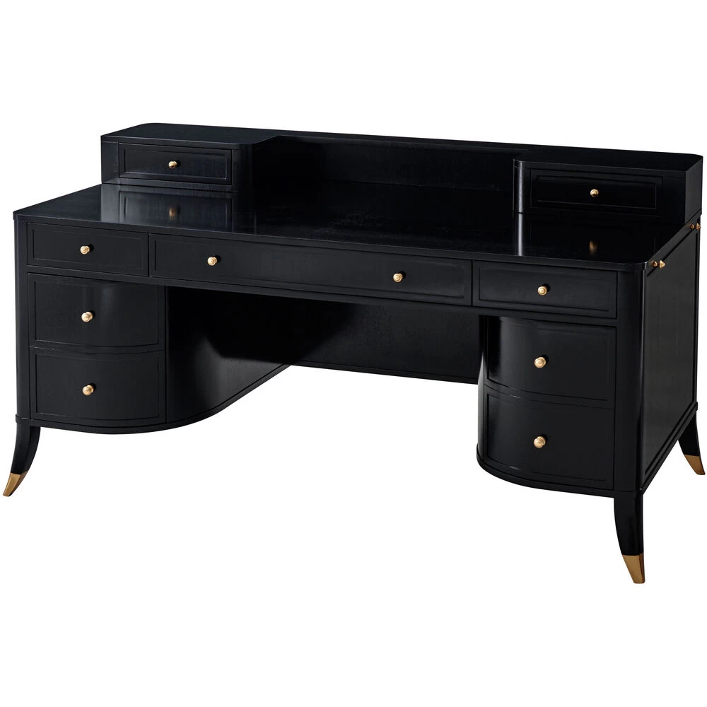 True to its French Moderne lineage, Gordon is a study in curves and angles. Two shapely filing drawers flank the kneehole. The desktop is ready to work with a two-drawer superstructure, and at the frieze, three drawers and two end slides. Set on splayed legs with brass cappings.