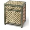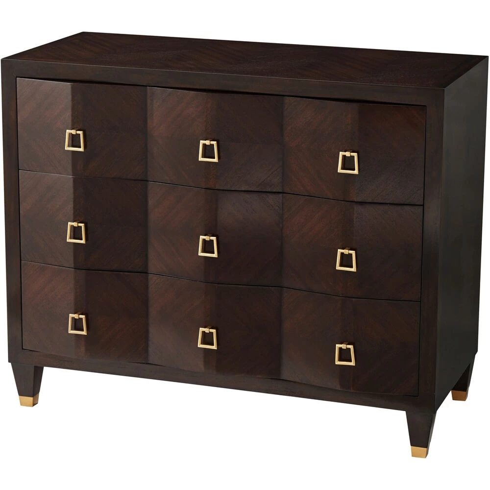 Three relief-shaped drawers, each with a trio of brass drop handles distinguish this chest of drawers. Modern, geometric and sculptural, Leif works a floor plan. Square tapered legs capped in brass. Chevron Mahogany veneered and crossbanded.