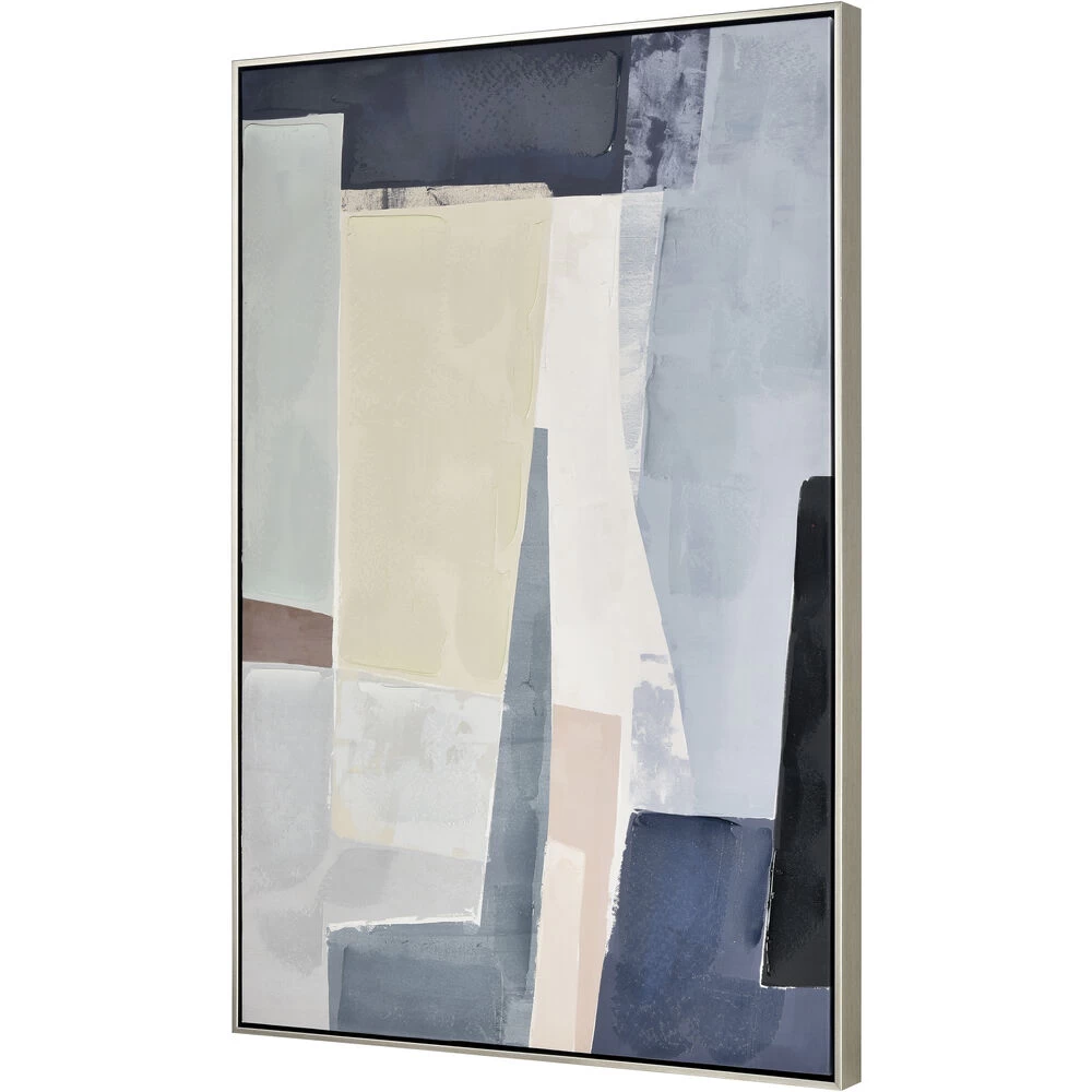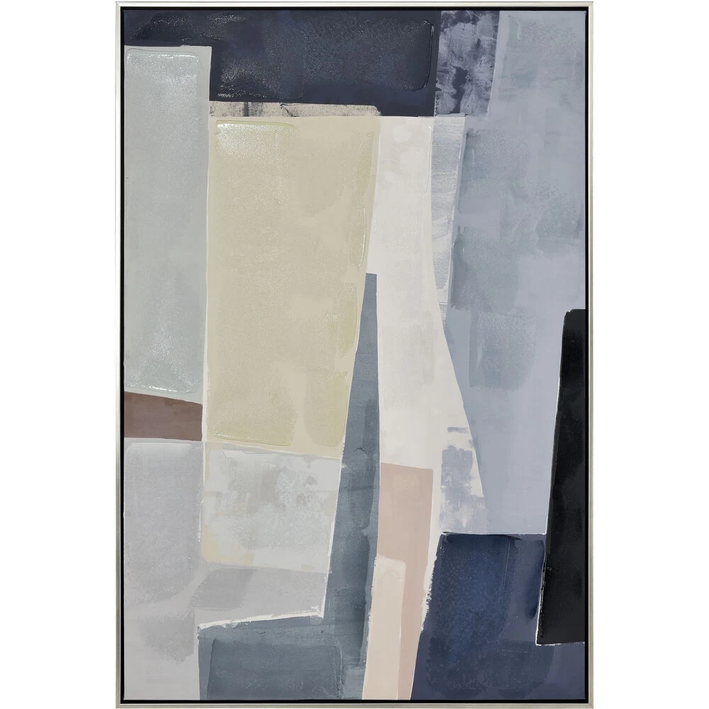Angle Abstract Framed Wall Art is a cubist color story comprised of pink, taupe and blue. The layered colors make a bold statement in any space. A thin silver frame completes the look.