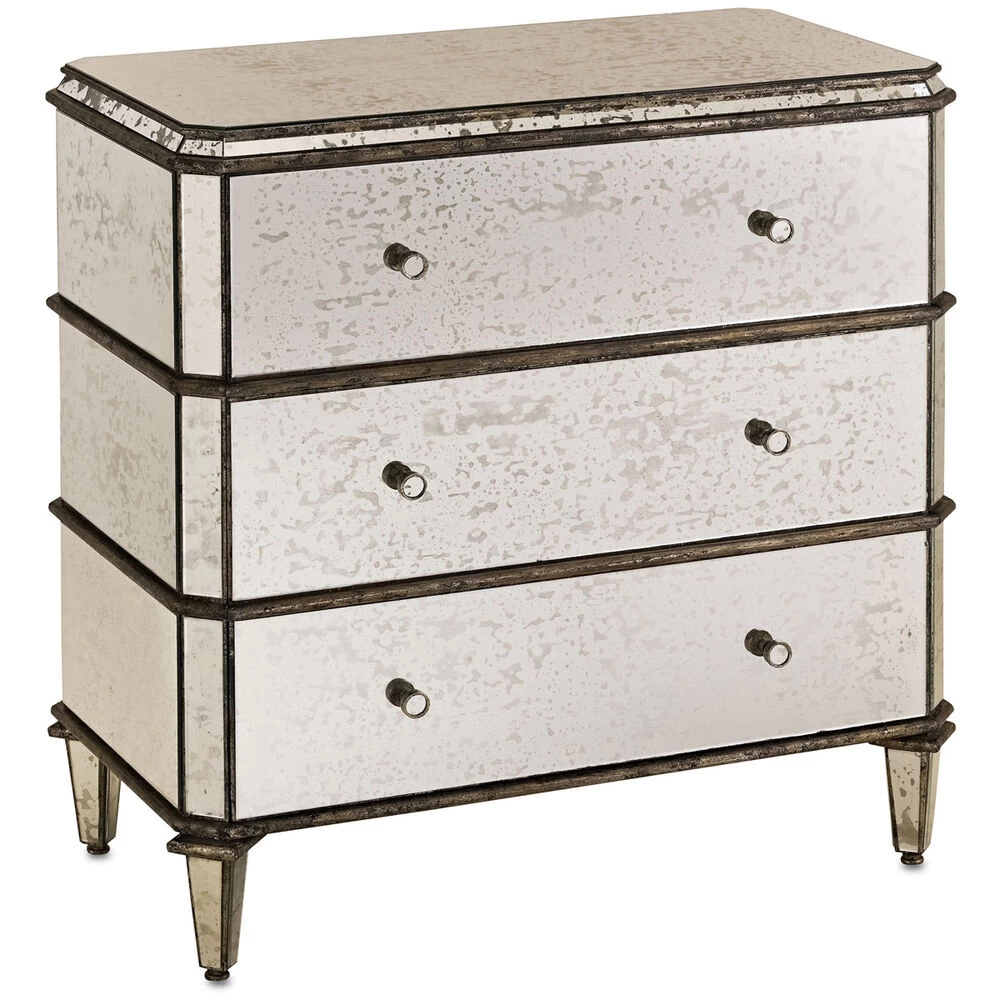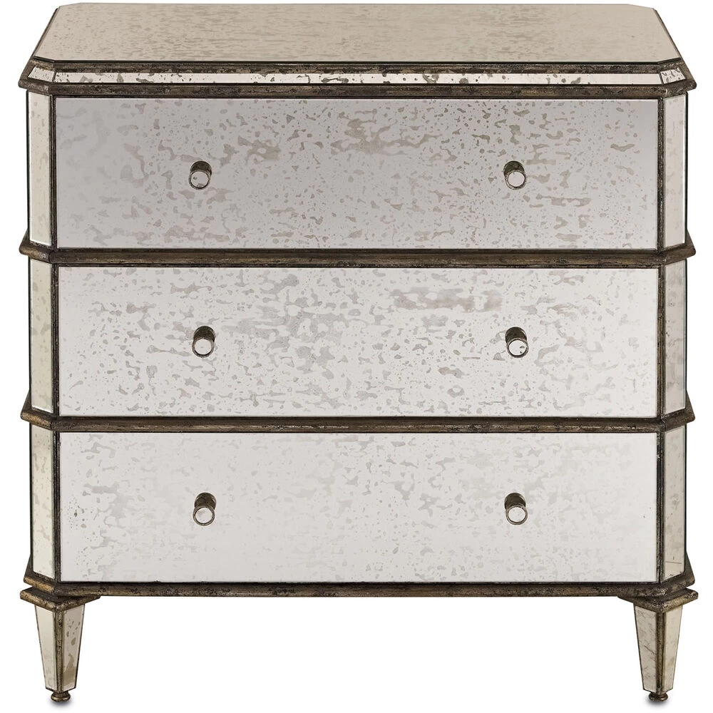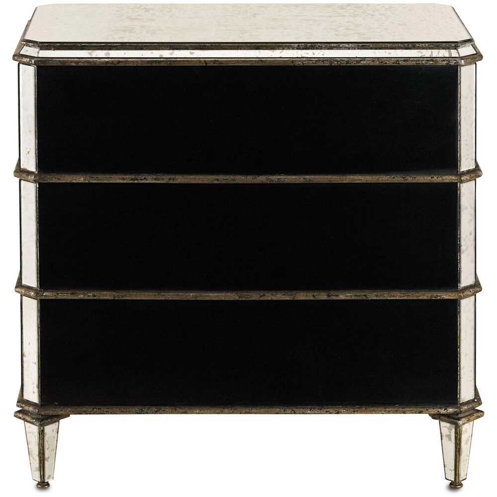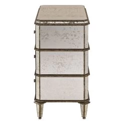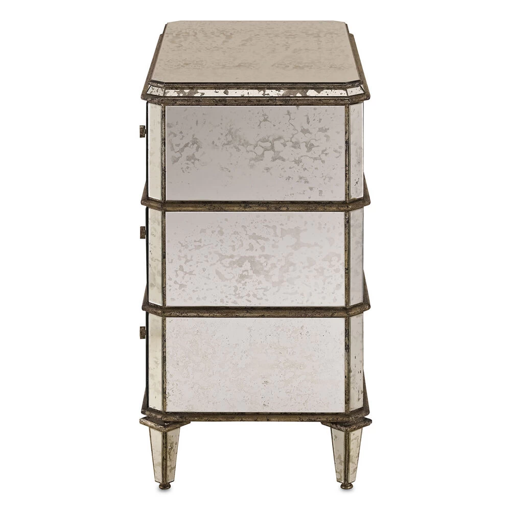 Echoing the masterful adeptness that Venetian glassmakers achieved when they turned their attention to furniture, the Antiqued Mirror Chest is covered in mottled glass that reflects the time-honored style of its namesake. Three generously sized drawers offer ample room to store clothes, linens or any number of items. The drawer pulls and tapering feet of this chest are also covered in mirror for a finely finessed design. There are other pieces in this lovely family of products.