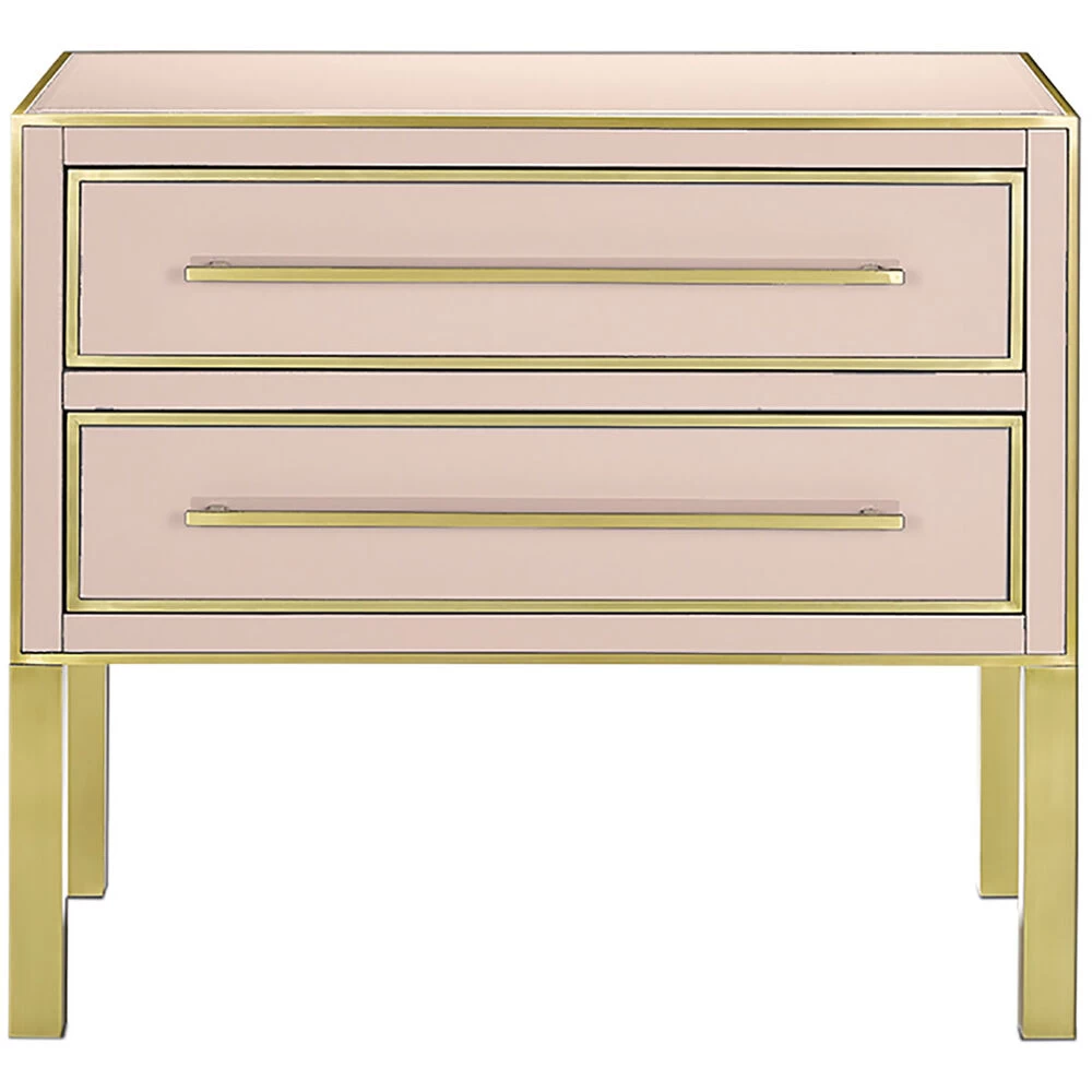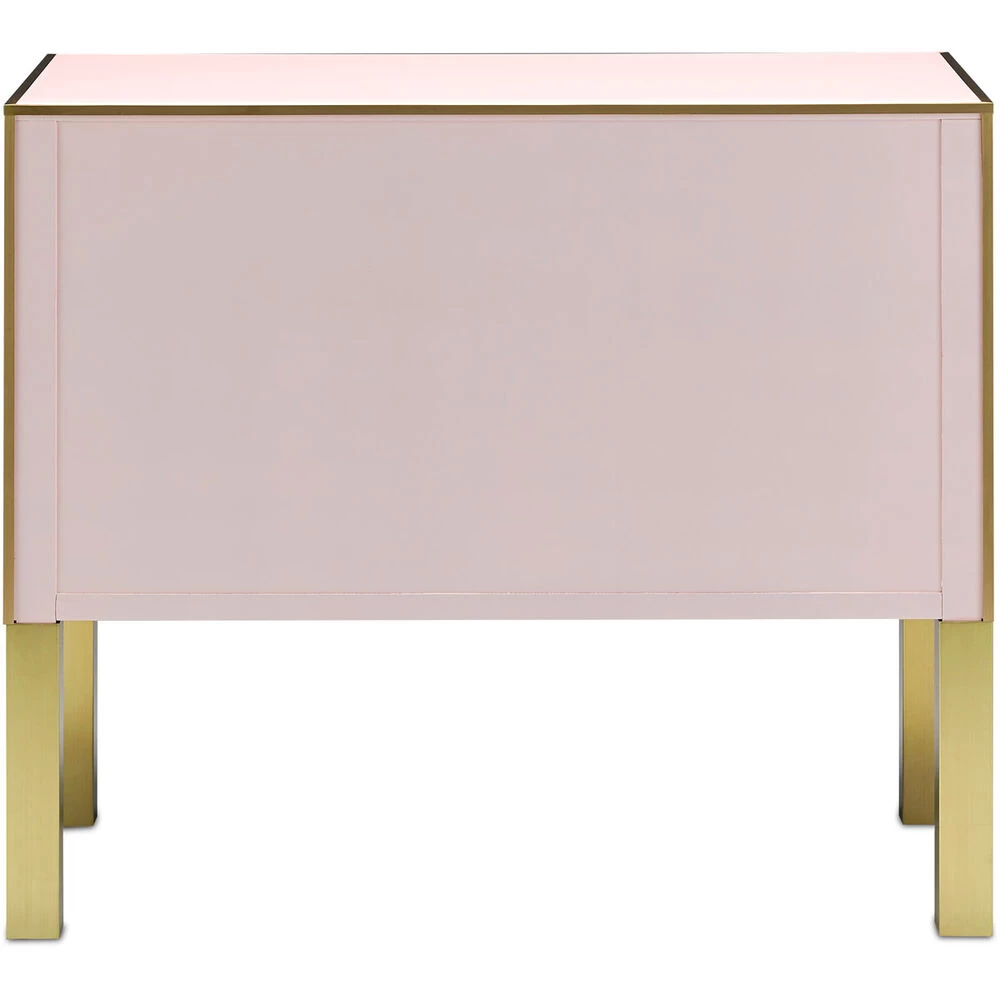 The peony version of our Arden Chest is inspired by a 1970s reverse-painted glass antique found at the Paris flea market. The chest features silver peony reverse-painted glass panels on the top, front and sides with solid brass trim, hardware and cladded legs. The chest is an image of simple luxury with its pale pink hue, beveled top and drawers with soft close glides. This piece also comes in a handsome tornado painted glass. The Arden family of furnishings includes a number of pieces.