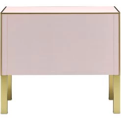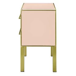 - Pantone Silver Peony Finish, Reverse Painted Glass Trimmed in Brass, Soft Close Drawer Slides, Adjustable Glides, Anti-Tip Kit