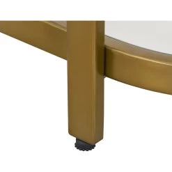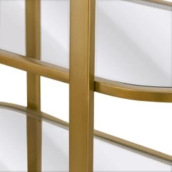 The Blain Bookshelf is a tall etagere-style display shelf with an oval shape and clear tempered glass shelves. The frame is made from a brass tone finished metal. This bookshelf can be used to display books and decorative items, and works in a variety of room styles.