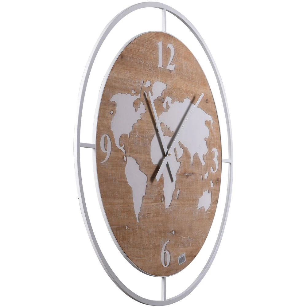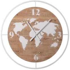 - This Wall Clock is a Natural Wood And White Color With a Map of the World Design On the Face.