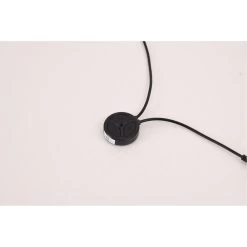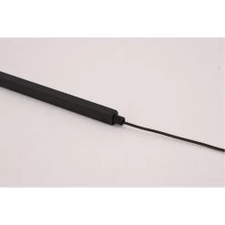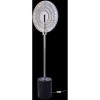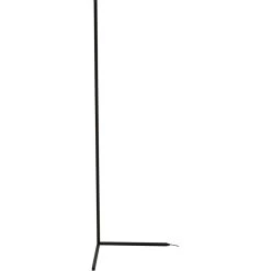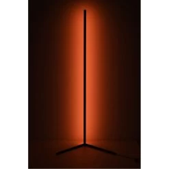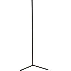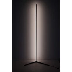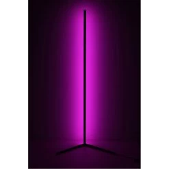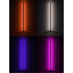 This dimmable LED floor lamp has a matte black iron and aluminum frame. The LED bulb is integrated into the frame with color change options. It can be controlled by remote or phone APP.