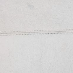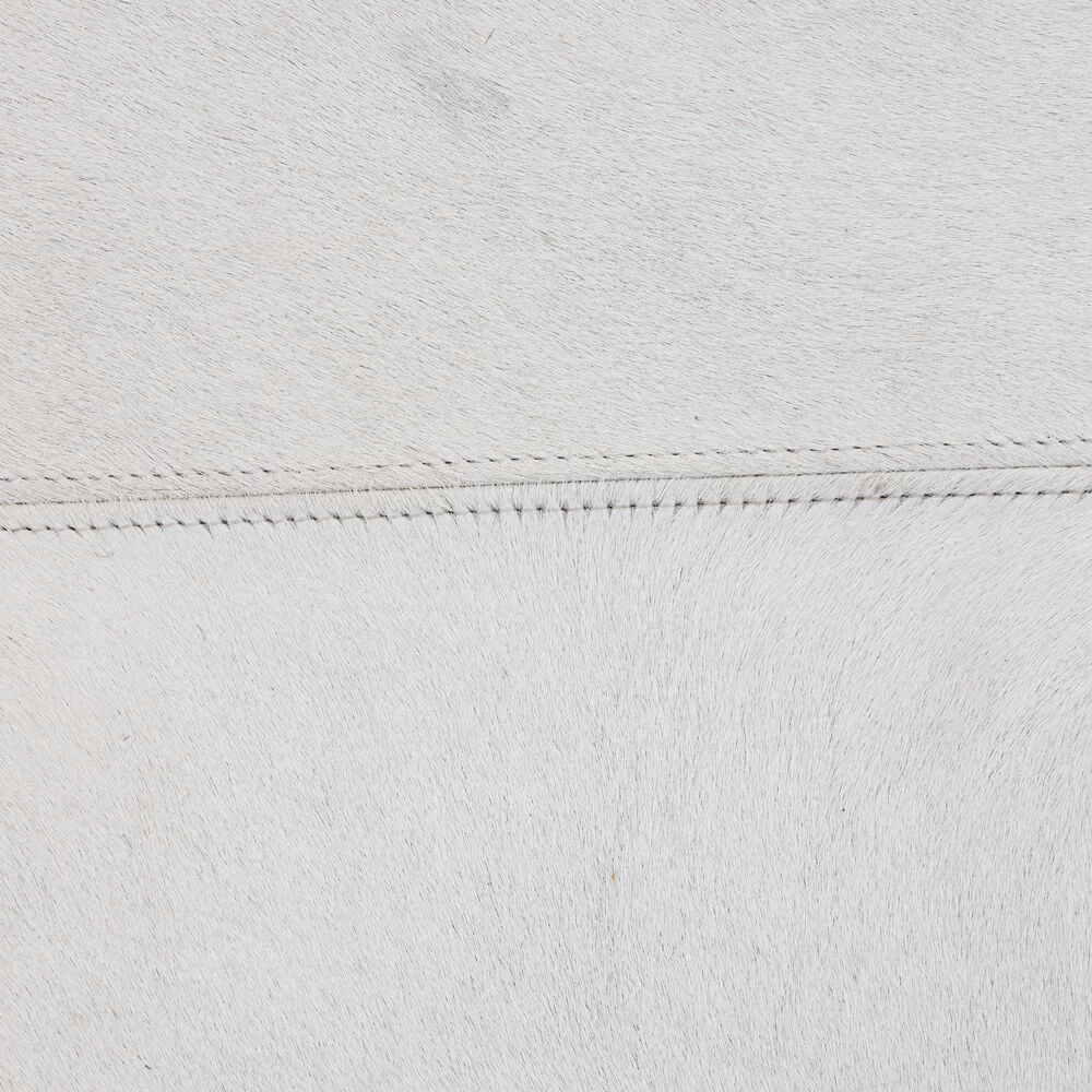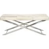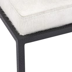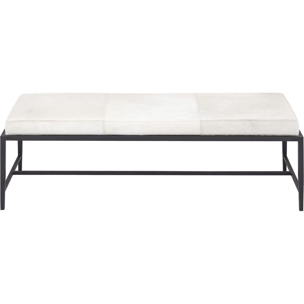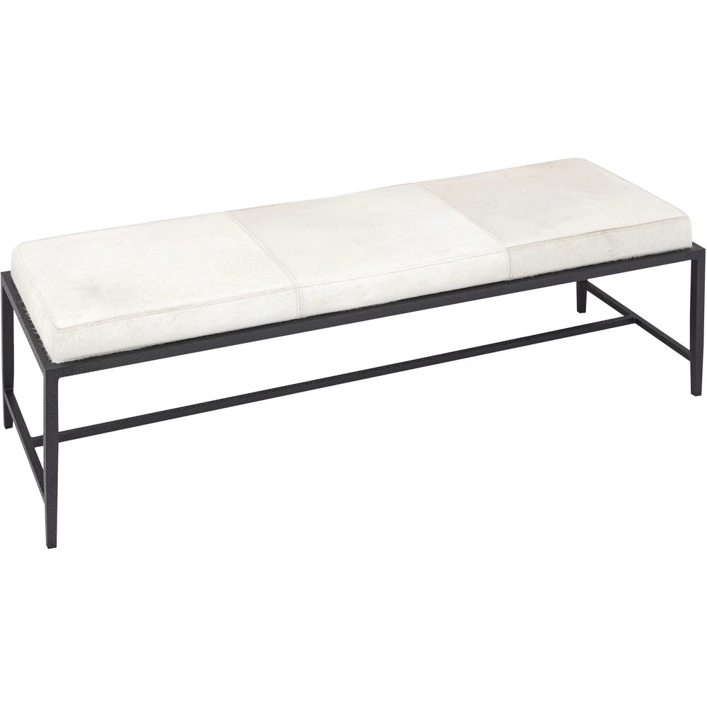 The Canyon Long Bench is a rectangular bench with an uphostered top and slender metal legs. The top is upholstered with hide and the legs and support beam have a hammered texture for added visual interest.