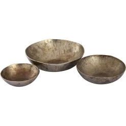 The Carling Bowls, sold as a set of three, are made from cast aluminum with an oxidized metal finish. Each round nesting bowl has a slightly imperfect shape, lending a wabi sabi aesthetic to these beautiful organic bowls.