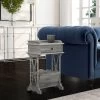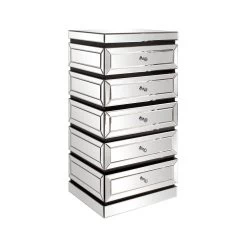 This striking Cabinet is the epitome of functional style. It features a mirrored body of clear glass. Each of its 5 drawers are accented by cut glass hardware. Each mirrored panel of the Cabinet has a thin bevel adding to its style and beauty. This piece would work great in a bedroom set, in an entryway or anywhere that you need some glamorous extra storage! Pair up with the small and end table styles to complete the set.