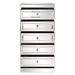 This striking Cabinet is the epitome of functional style. It features a mirrored body of clear glass. Each of its 5 drawers are accented by cut glass hardware. Each mirrored panel of the Cabinet has a thin bevel adding to its style and beauty. This piece would work great in a bedroom set, in an entryway or anywhere that you need some glamorous extra storage! Pair up with the small and end table styles to complete the set.