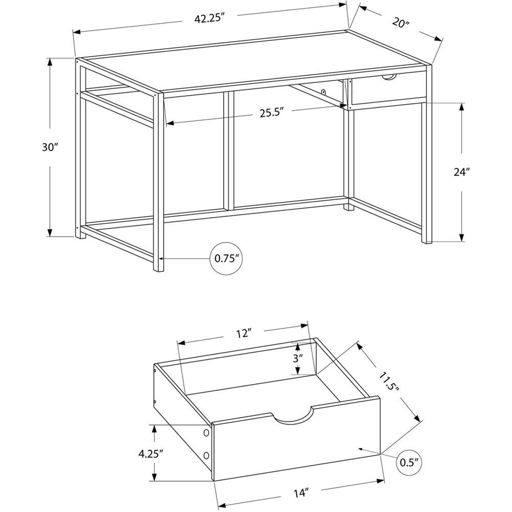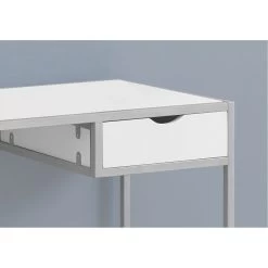 This contemporary two tone industrial look computer desk is the perfect combination of function, durability and design in a modern form. With clean lines, a chic white surface area and a sleek silver metal frame, this desk will add pizzazz to any home office or dorm room. The desk top provides ample surface area for a lamp, laptop or tablet while the drawer provides hidden storage for all of your additional office supplies. The perfect desk for small spaces!