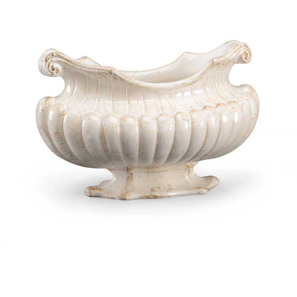 Create An Alluring Centerpiece For Your Dining Room Table Or Buffet With Our Oval Pot. This 12.5″ Oval Pot Is Crafted Of Antique White Glazed Italian Ceramic. The Fluted Sides And Scrolled Handles Add Texture And A Touch Of Elegance.