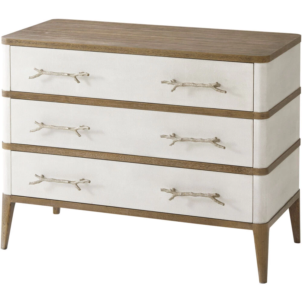 Nightstand or ChestFigured Ofram Veneer & Solid OakCerused Mangrove FinishKomodo Embossed Leather PanelledThree Drawers with New Champagne Finish Textured Coral Cast Handles