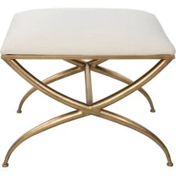 Classic Yet Stylish, This Small Bench Features A Curved Iron Frame Finished In An Elegant Gold Leaf. The Cushioned Top Is Upholstered In A Crisp White Fabric, Doubling As A Comfortable Seat Or Footrest.