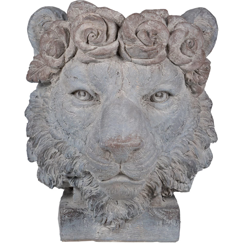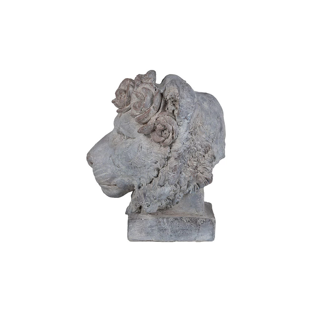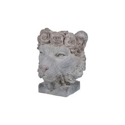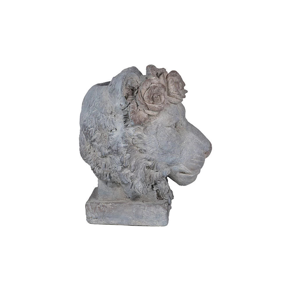 At once whimsical and dignified, this lion planter with rose crown also works beautifully holding prized plantings. The fine details of the roses, the lion’s proud expression and furry face are enhanced by the aged-looking gray finish. A fun accent for inside living spaces or outdoor gardens.