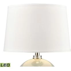 The rounded shape of the Culland Table Lamp is made from azure blue glass with polished nickel appointments and sits on a clear, crystal base. This design is the perfect complement to a coastal or transitional style bedroom, living room or hallway, adding a subtle pop of cool, inviting color. The fresh look is topped by a round, hard back shade in white linen.