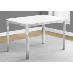 Get ready to bring a wow factor to your dining space with this bold, modern rectangular dining table. While the one inch thick table top has sophisticated white finish, it contrasts beautifully with an edgy chrome apron and sturdy square metal legs. This versatile table comfortably seats up to 4 people for fun get-togethers in a formal or casual dining room or kitchen setting. The compact size will bring a room to life in small homes, apartments, or condos. Chairs are sold separately.