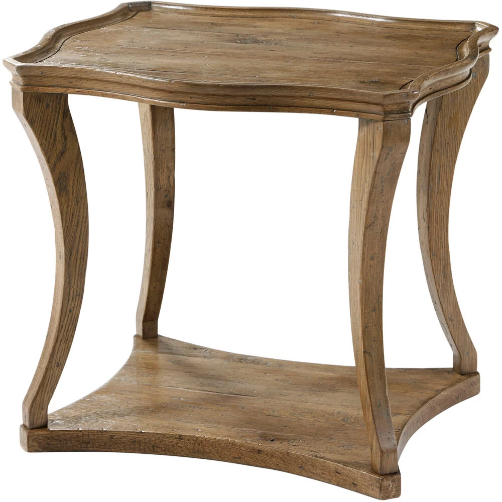 Serpentine Side TableRustic Oak and Oak ParquetryLight Echo Oak FinishPlanked Top with Tray Molded Piecrust EdgeSabre Legs with a Concave Sided Platform Undertier