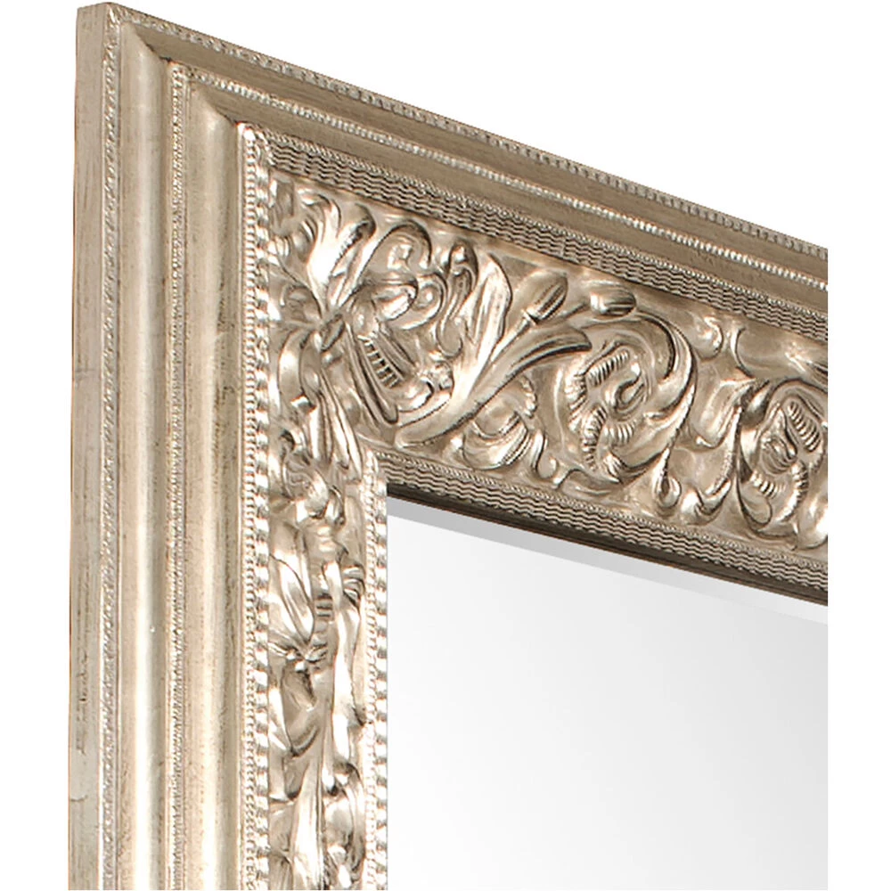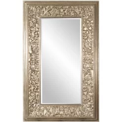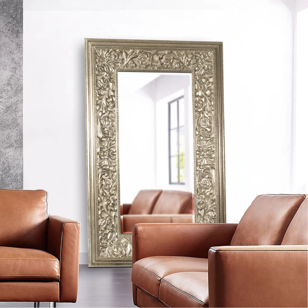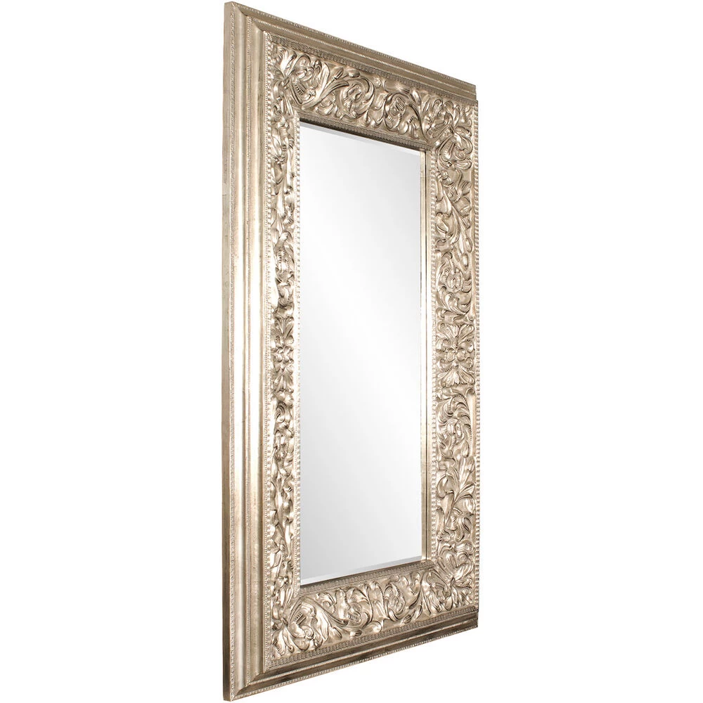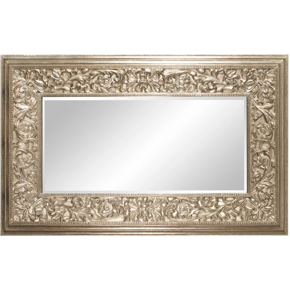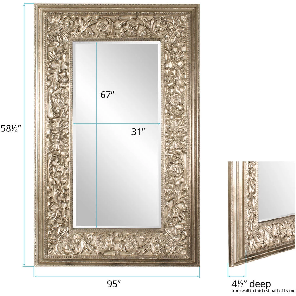 Our Emperor Mirror features a large rectangular frame. Its thick frame is carved with an intricate design of ornate flourishes. It is then finished in a lovely champagne silver. Make an room appear instantly brighter and larger simply by adding the Emperor Mirror. It is a perfect piece for an entryway, living room, bedroom, or any room in your home! The mirror is beveled adding to its style and beauty. It is a perfect focal point for an entryway, bathroom, bedroom or any room in your home. D-rings are affixed to the back of the mirror so it is ready to hang right out of the box! It also comes with special security hardware to secure the piece when using as a floor mirror.
