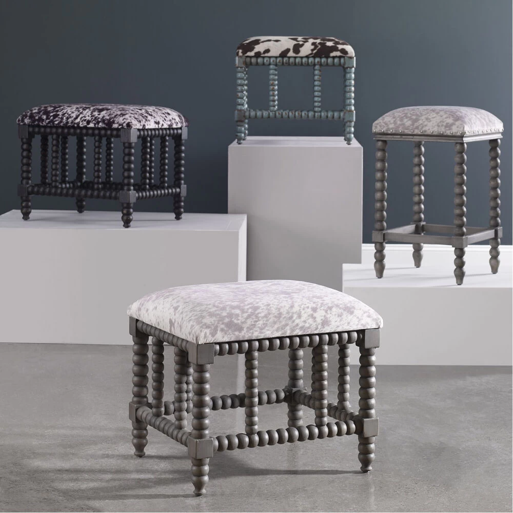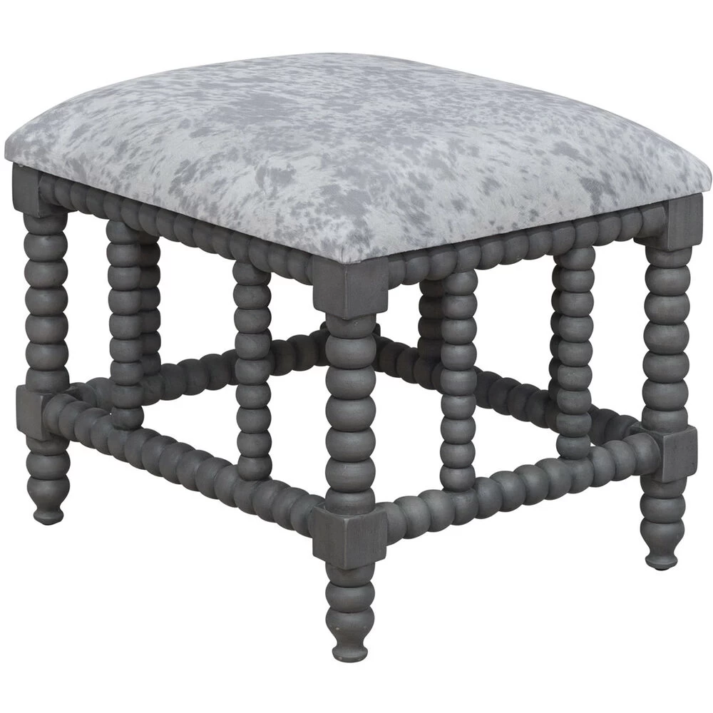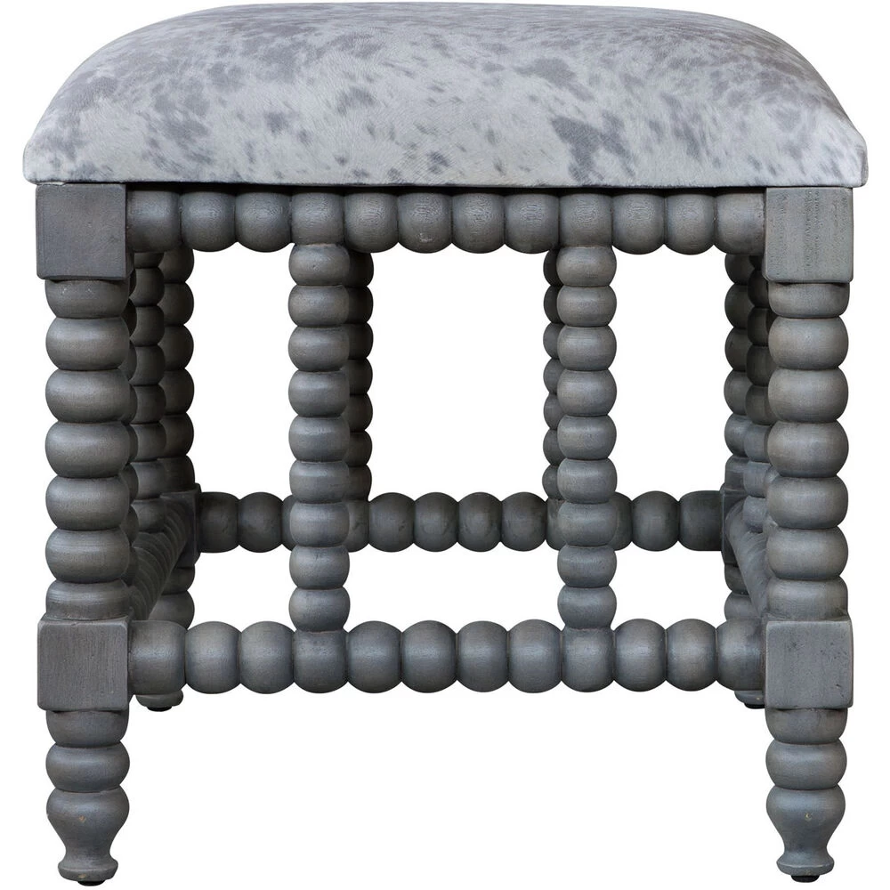 Ranch And Modern Lodge Styles Converge To Create This Plush, Upholstered Bench. The Cushioned Seat Is Wrapped In A Light Gray And White Faux Cow Hide, Accented By A Dry French Gray Stained Turned Wooden Base.