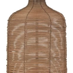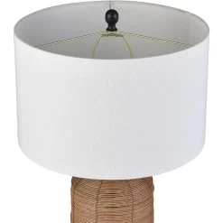 The Euclid Table Lamp has an upscale nautical feel. The body is wrapped in sustainable wicker around a metal frame, contrasted with a black base and finial, and timeless white linen drum shade.
