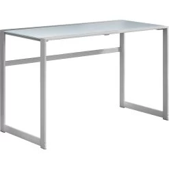 If you are looking to upgrade your work space then start with the sleek design of this simple, modern computer desk. The chic frosted white tempered glass desk top is supported with strong silver metal u-shaped legs and a support bar across the back. With enough room to place a laptop, a lamp, office supplies, or a decorative object the compact size of this desk is also ideal for small spaces without sacrificing style. Assembly is required.