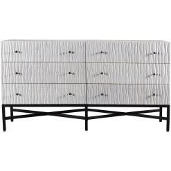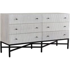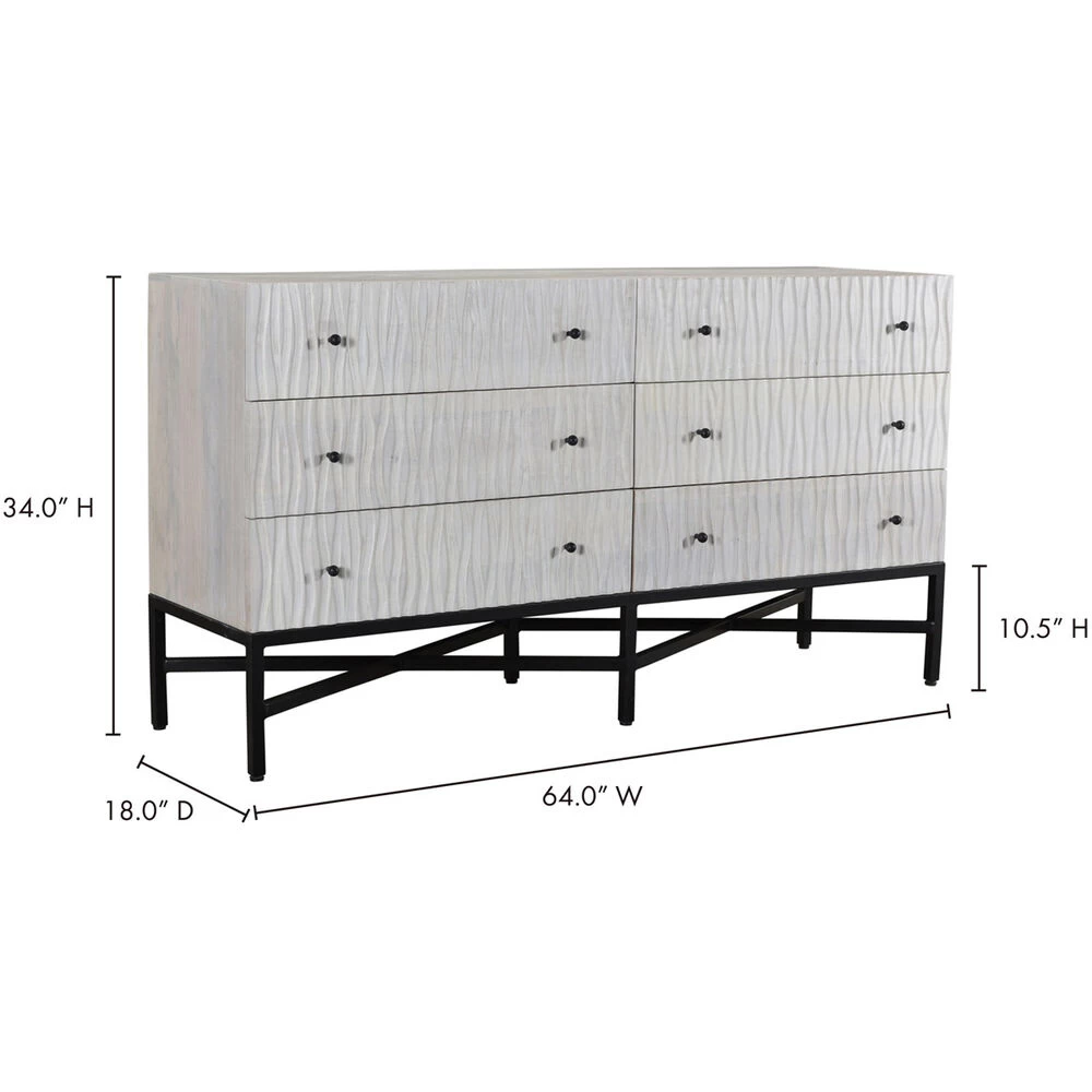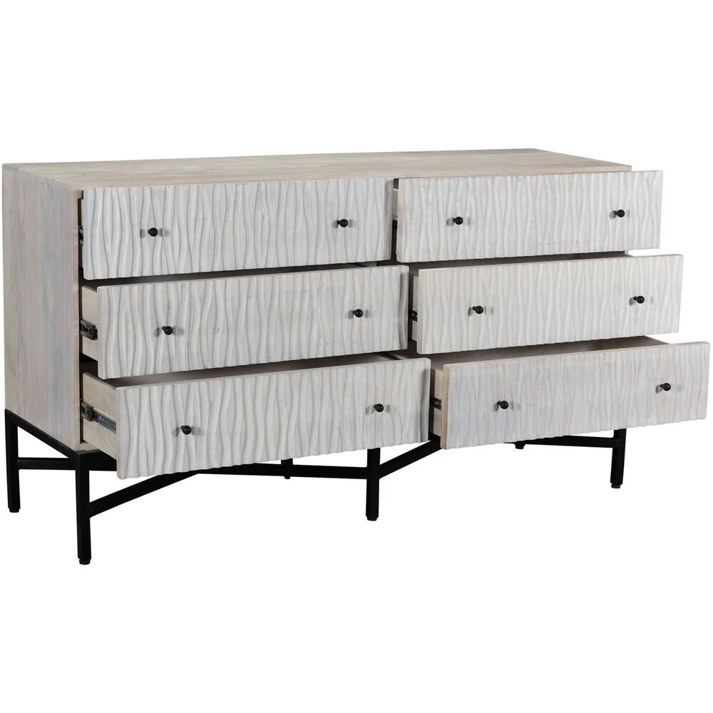 - Top Material: Solid AcaciaDrawer Count: 6 / Drawer Weight Capacity (Lbs): 100 / Drawer Glide Mechanism: Side Mount Ball Bearing Glides / Drawer Interior Width: 28.74 / Drawer Interior Depth: 13 / Drawer Interior Height: 5.1 / Drawer Glide Material: Metal / Drawer Safety StopOpen Shelving / Number Of Open Shelves: 1Leg Height: 10.5Composite Wood Product / Wood Finish: Oak White / Gloss Level: MattFinished BackHardware Finish: Black / Hardware Material: MetalHandle Finish: BlackTipover Restraint Device Included