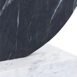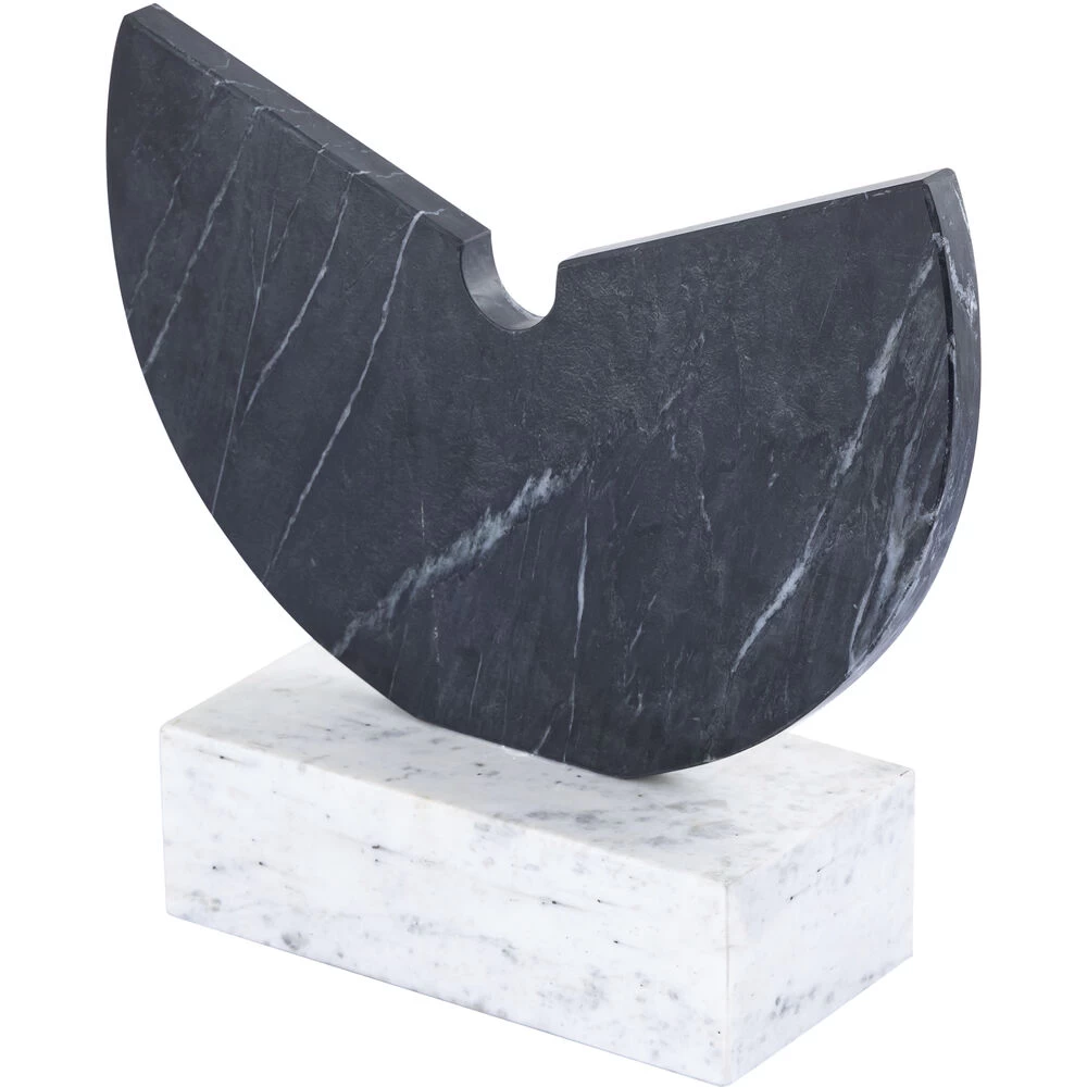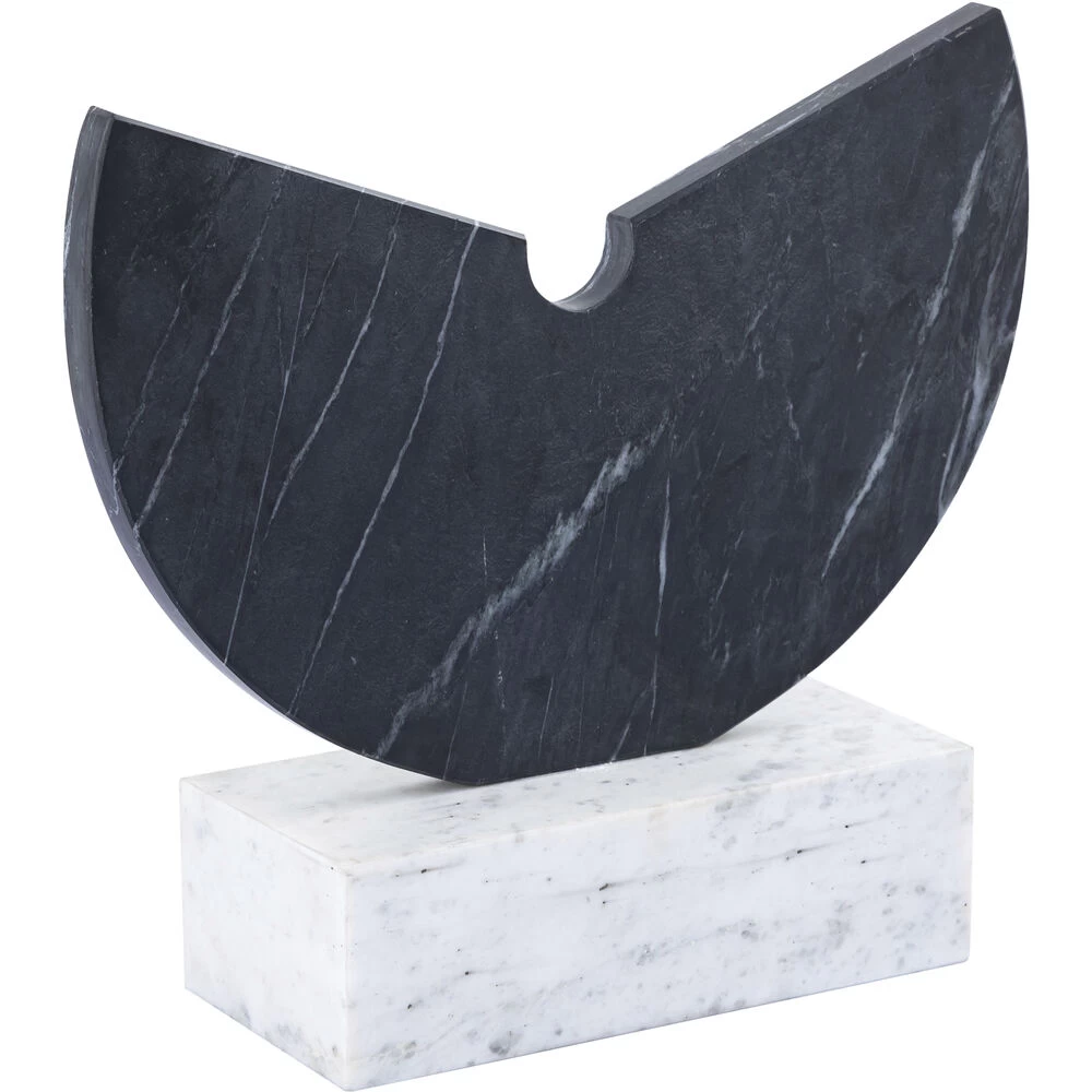 The Fan Decorative Object is an abstract black marble sculpture mounted on a white marble rectangular base. The sculpture has a notched demilune shape, and the black marble features natural veining that will vary by item.