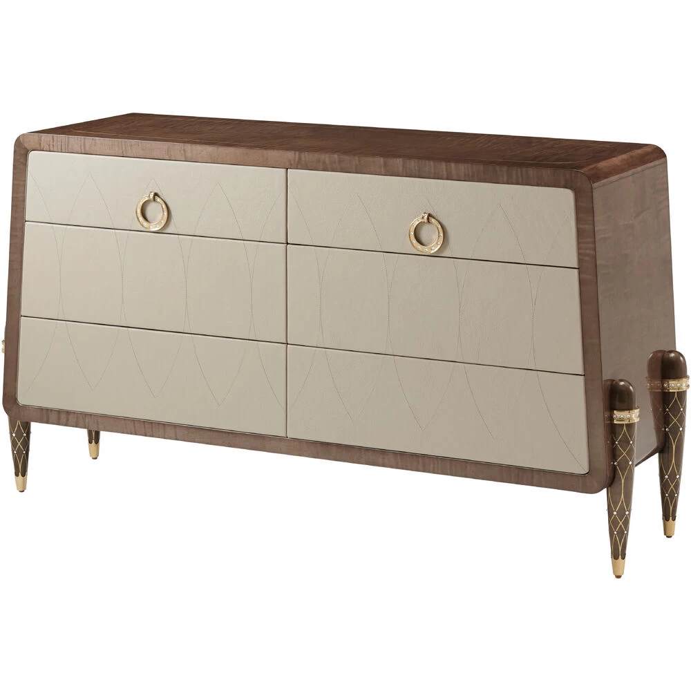 “Curly Maple Veneered with Agate FinishBrass Oval Inlaid Waterfall TopSix shaped Drawers with Sans Traverse Ellipse Stitched LeatherThe Top Two Drawers with Crystal set Brass HandlesOn Torpedo Legs with Interlacing Brass Ellipse Inlay & Crystal set IntersectionsFinely Crystal Set Cast Brass Ring Capitals & Tapered Tiara Cappings”