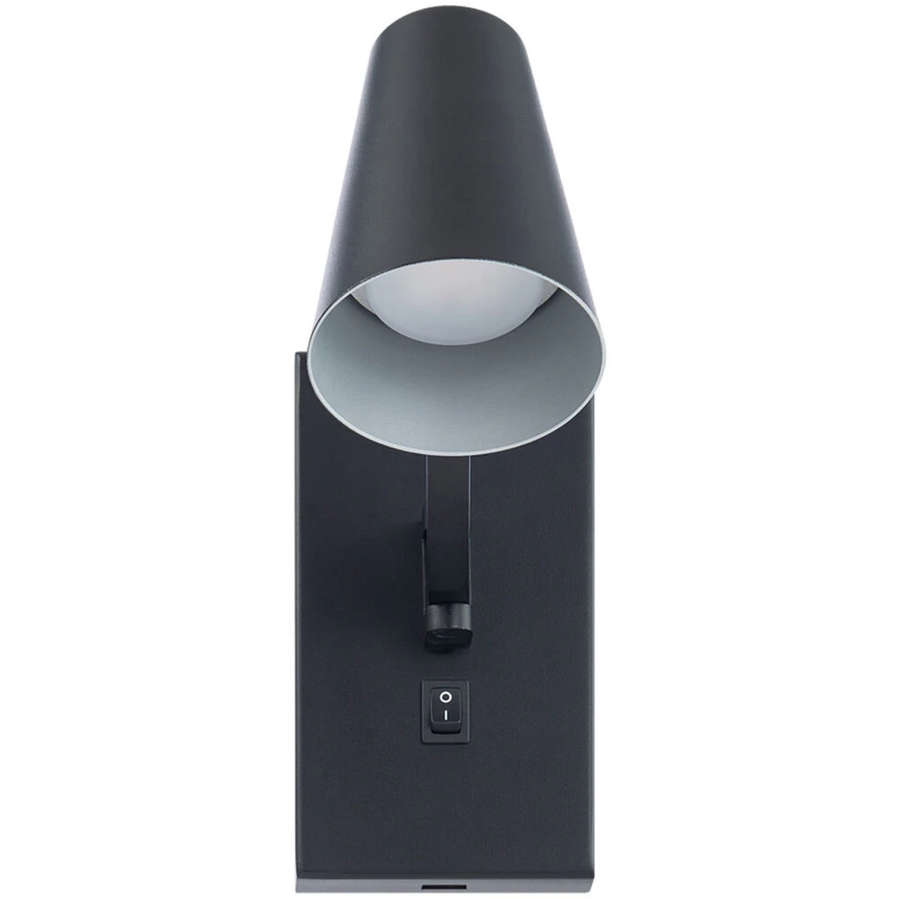 - Features an aluminum construction with a glass diffuser. Lamp head has a 180 degree horizontal rotation and the base includes an on/off toggle switch with a USB charging port at the bottom of the backplate.