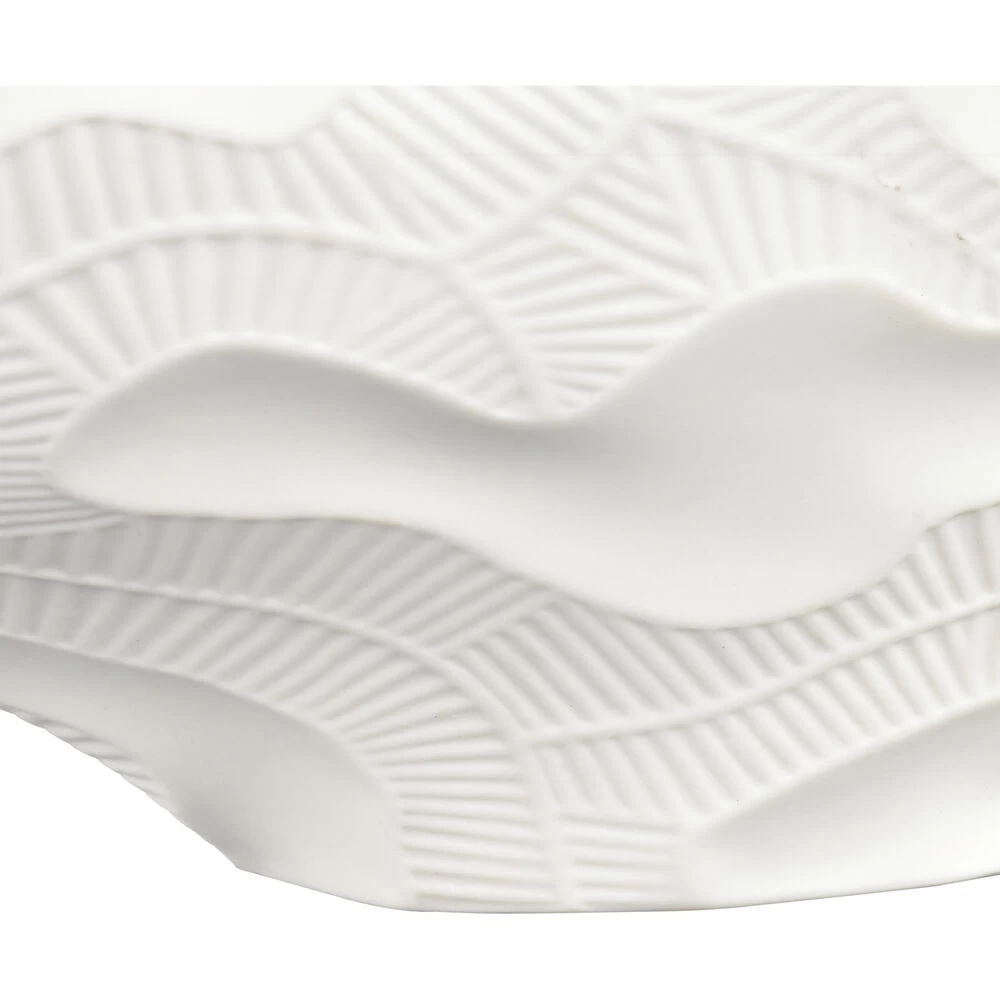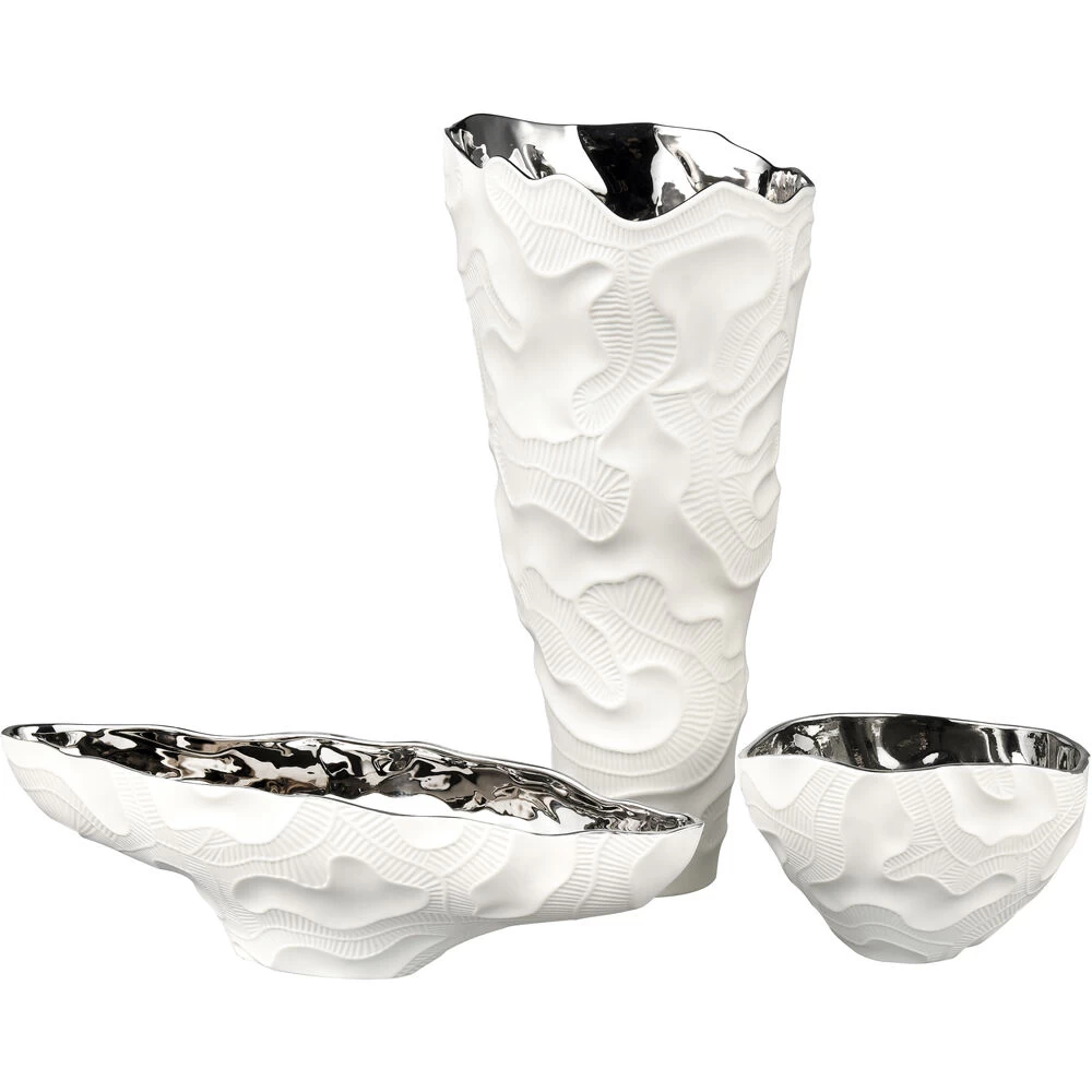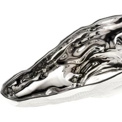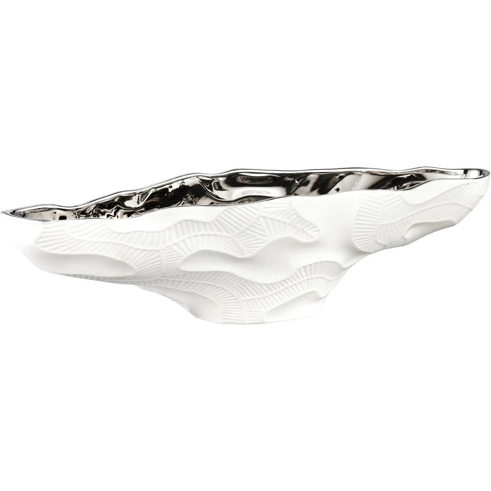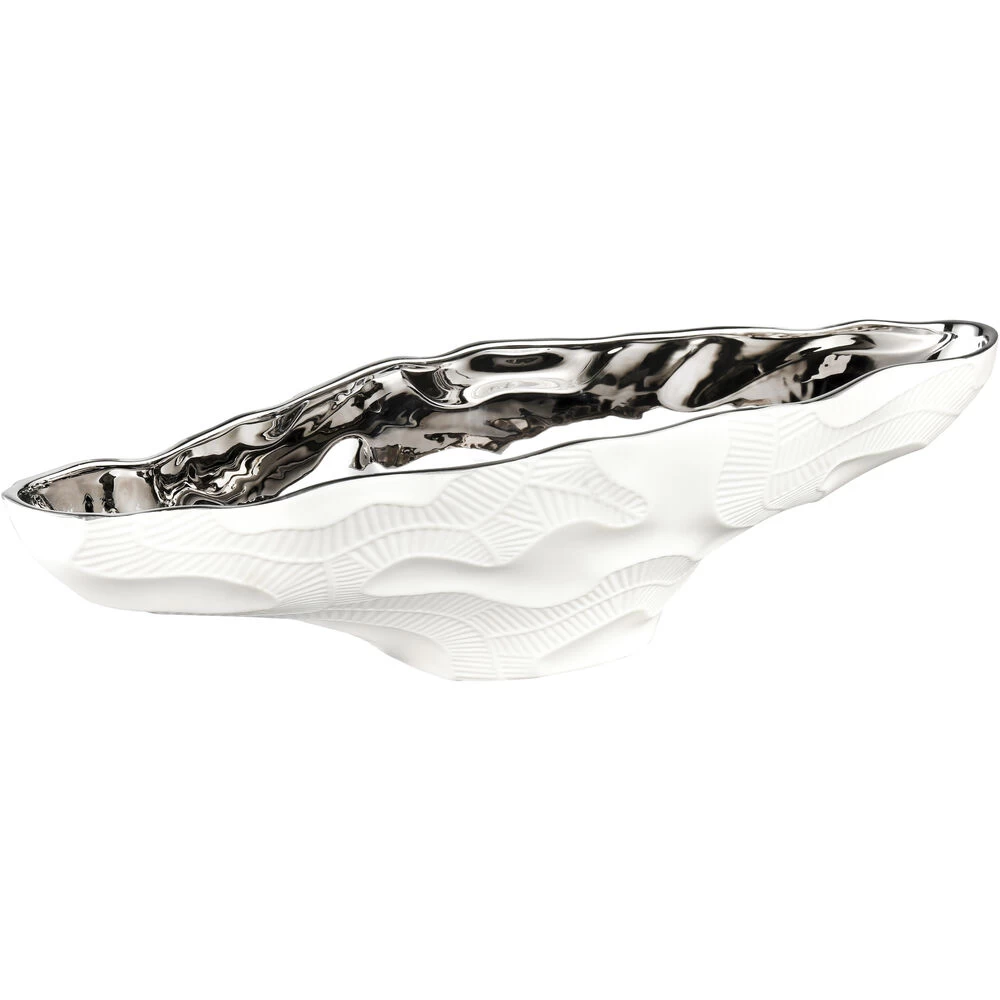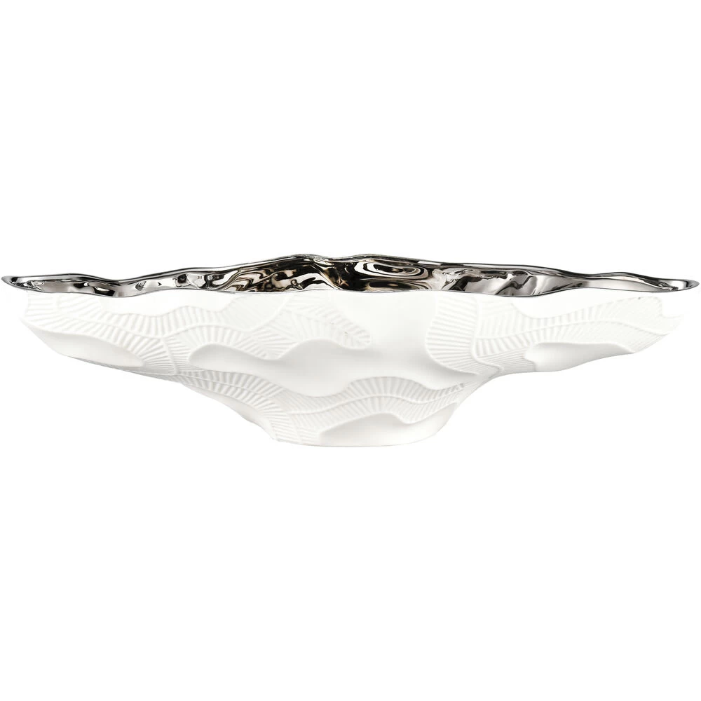 The Mabley Bowl is a decorative earthenware bowl with a matte white outer texture and a glazed silver textured interior. This low, wide bowl is ideal for entertaining or adorning a richly layered tablescape.