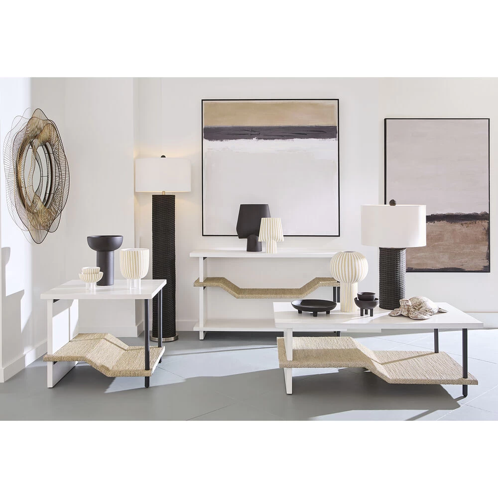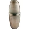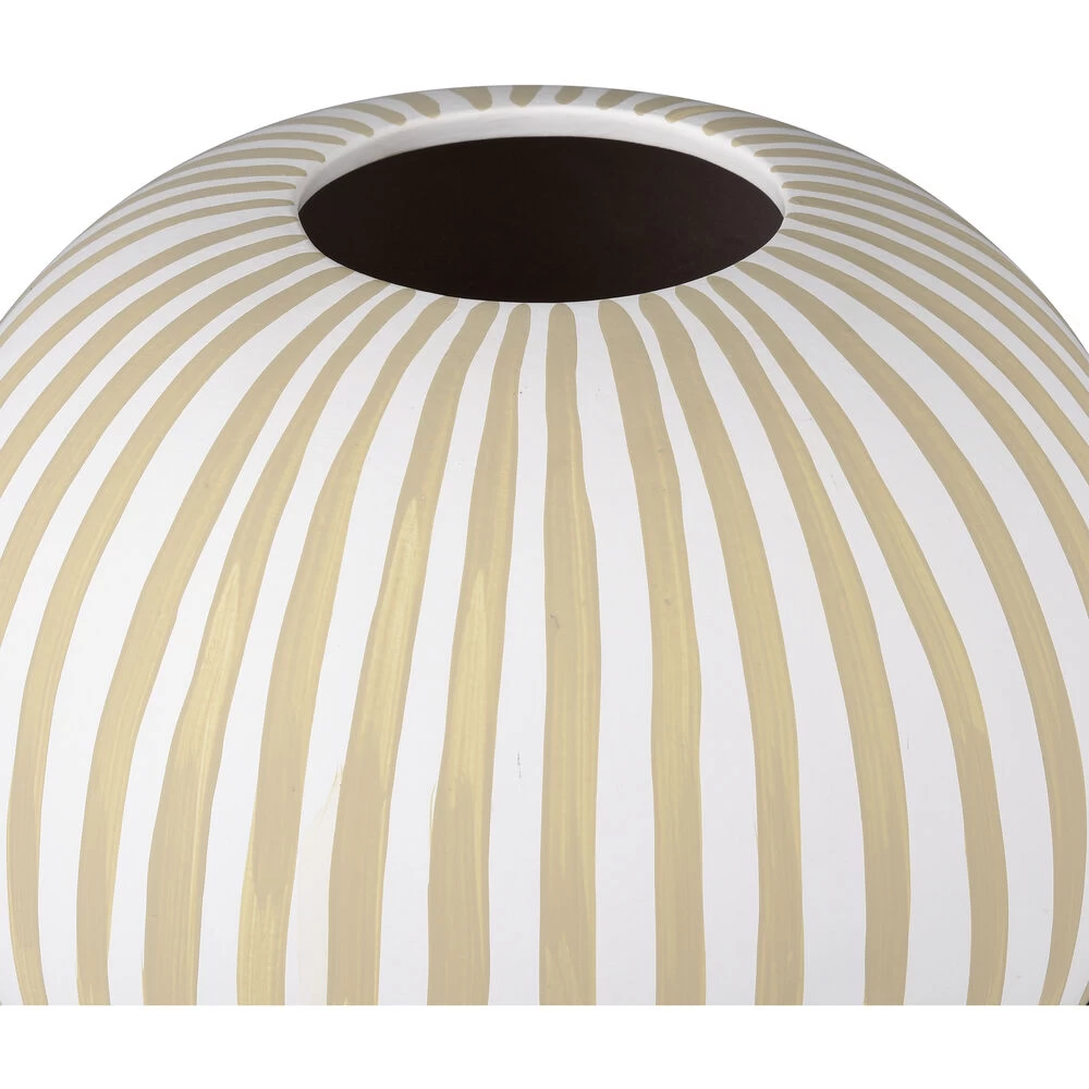 The Hawking Large Vase has an elongated cylindrical base topped with a sphere with a narrow mouth opening. The earthenware vase has a white and taupe striped painted finish and a sculptural, playful aesthetic.
