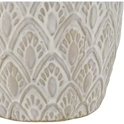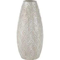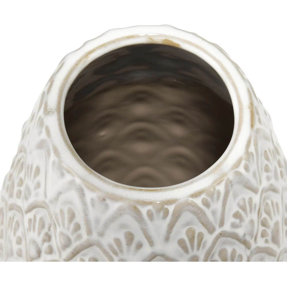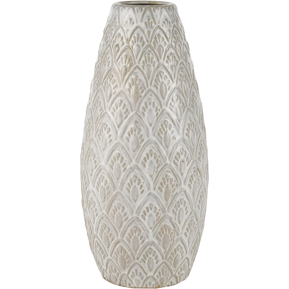 The small Hollywell vase features a petal inspired, textured surface and comes in an aged white, glazed finish. The subtly rustic style of this design makes it ideal for a modern farmhouse setting or a relaxed coastal style space.