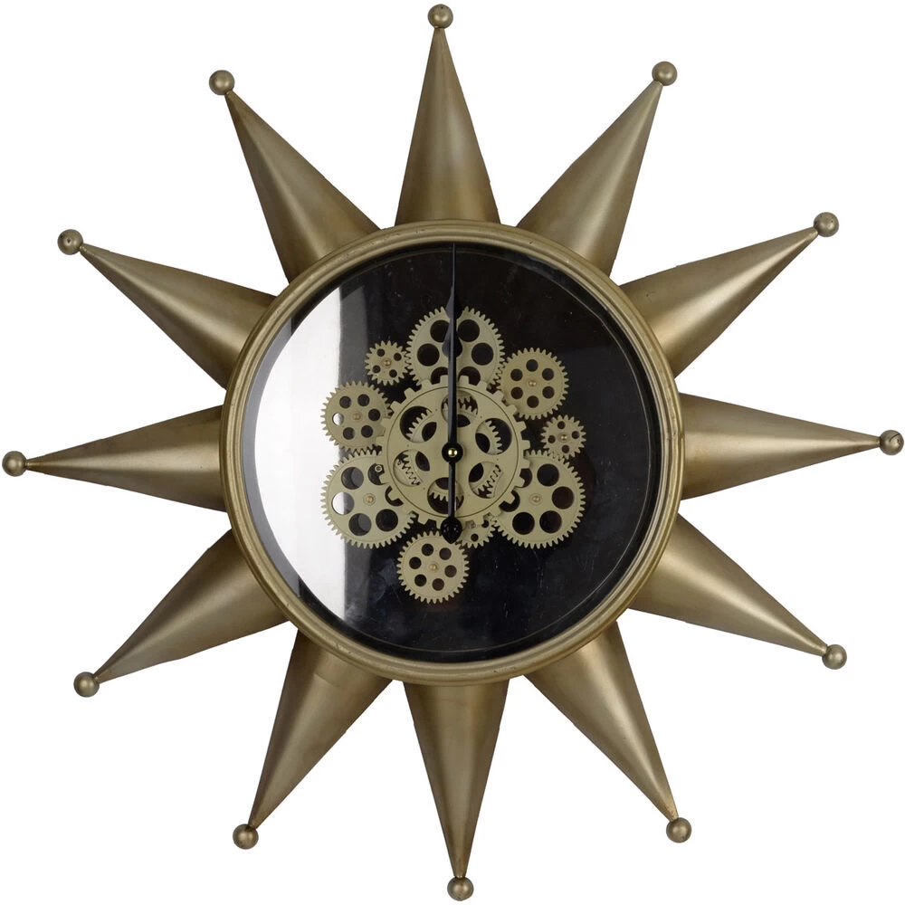 Display the bold and distinctive Ignacio Star Wall Clock to create an instant focal point within any space. This piece features a wide decorative frame in the shape of a many-pointed star, crafted from sturdy iron and finished in silky smooth antique brass. Decorative gears stand behind the transparent glass for a touch of industrial appeal.