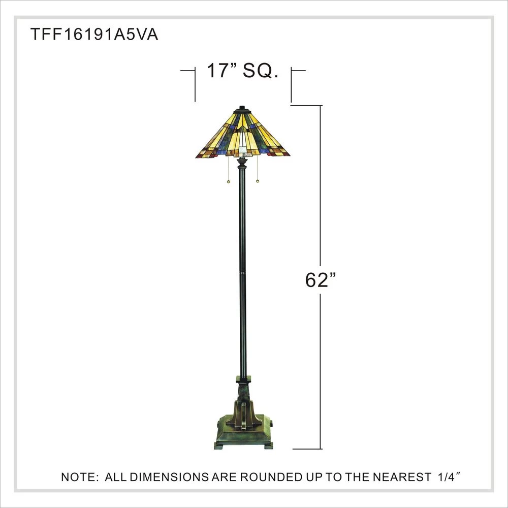 This Arts and Crafts style features a pyramid shade with a stepped border for added visual interest. The classic geometric design includes art glass in shades of amber cream and tan accented with glass pieces in sapphire blue and rich green. The linear geometric details on the base makes it a perfect complement to the shade.