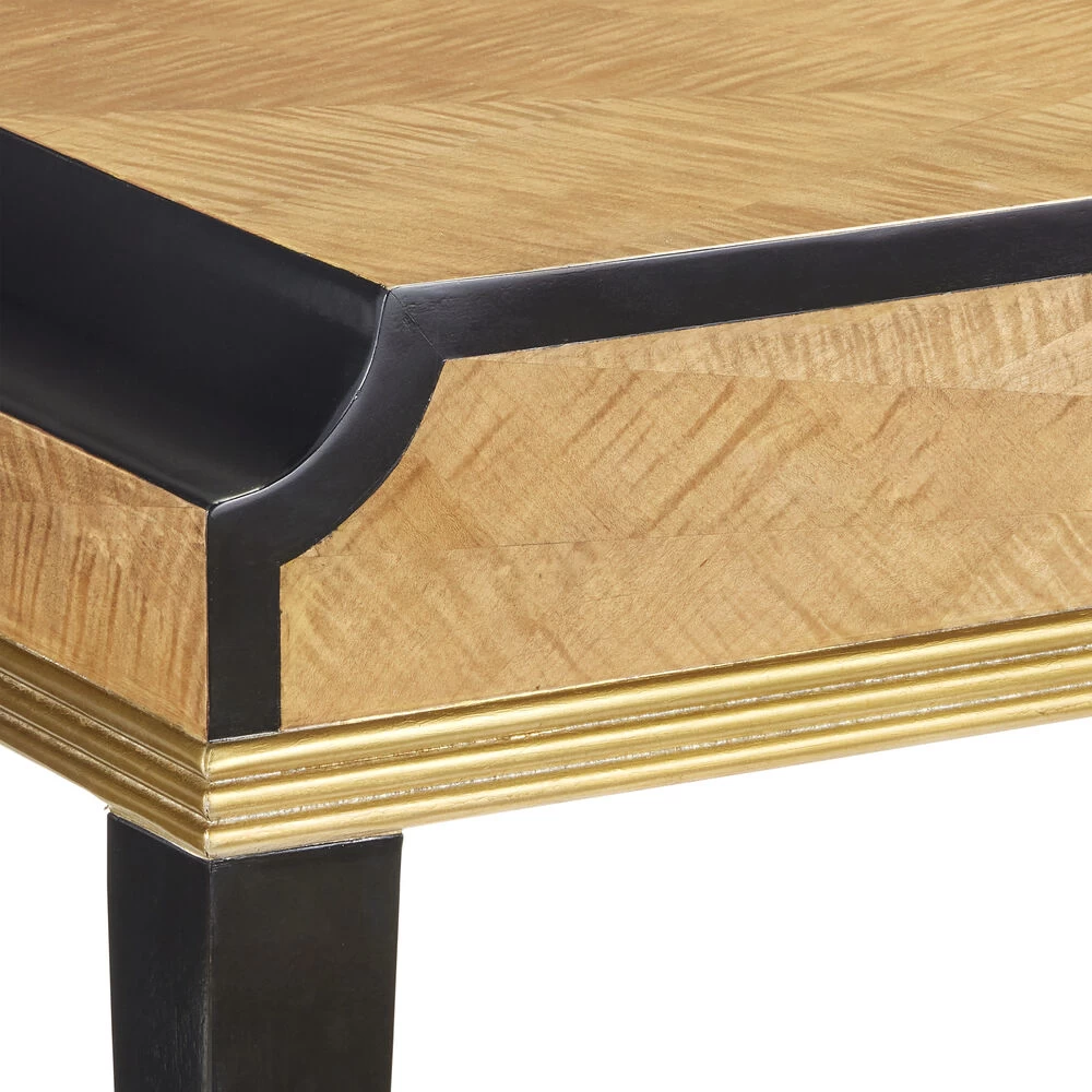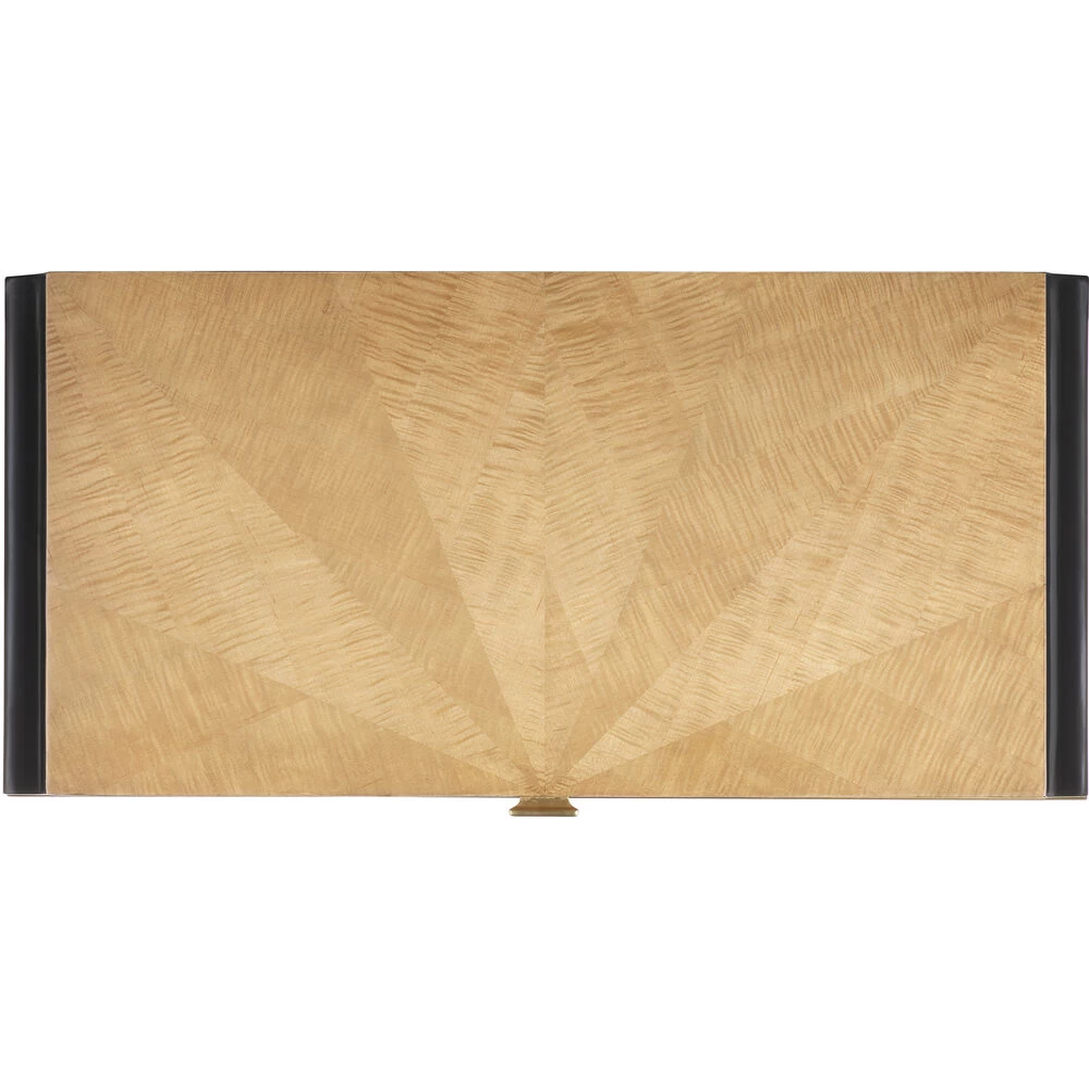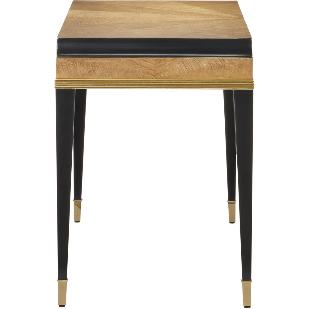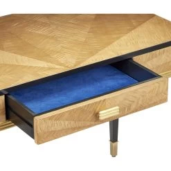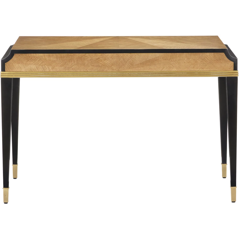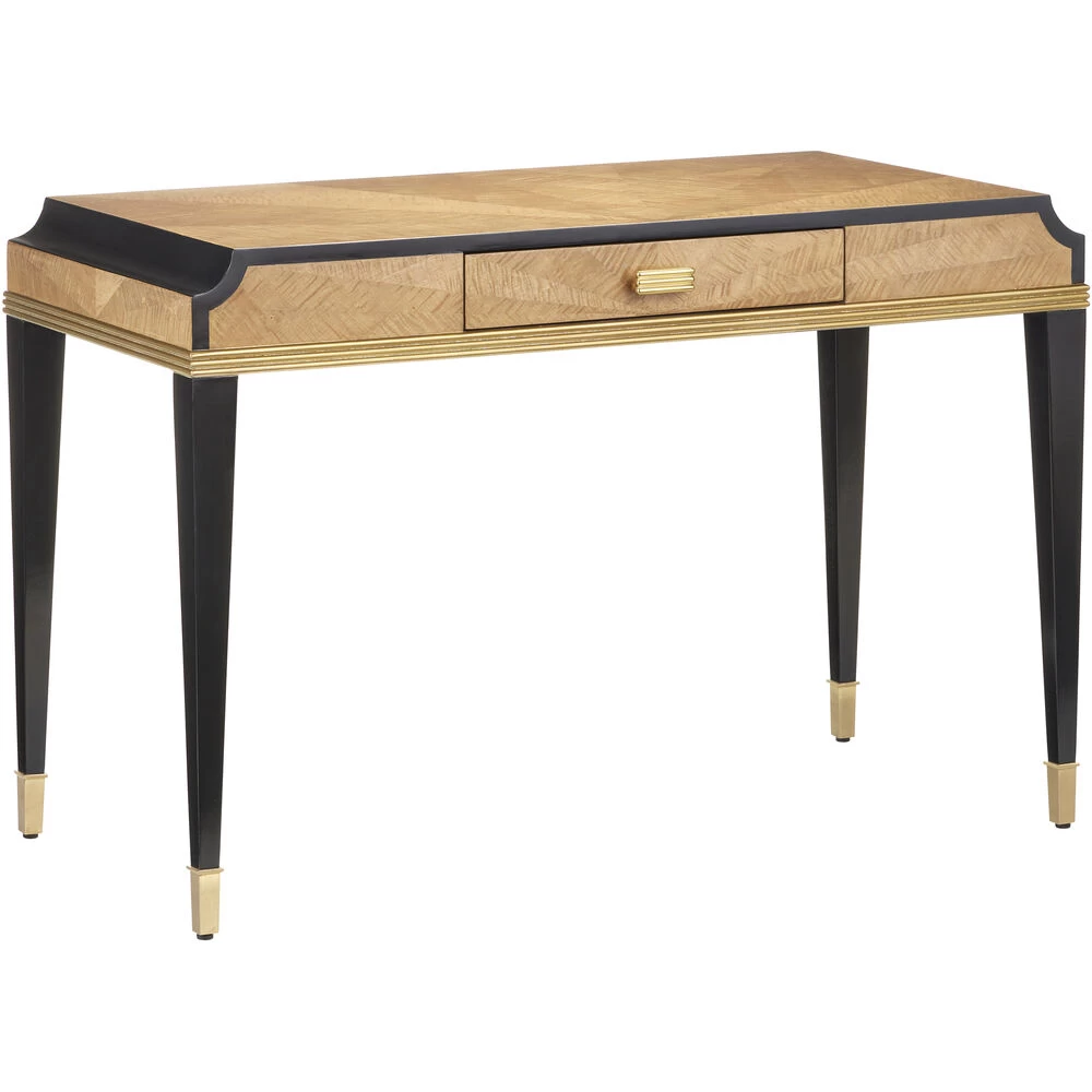 The Kallista Writing Desk has a taupe finish that enlivens the figured sycamore veneers, the wood grains bringing the desk a hint of distressing that contrasts the rich black elements. The drawer-pull, ferrules and linear accent that wraps the desktop where it meets the legs are in a polished brass finish. Specialty treatments on this artful tan desk include wood drawer slides and a radial starburst pattern on the veneers.