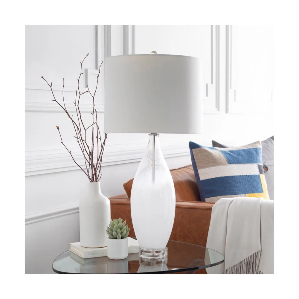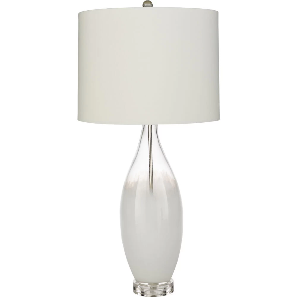 - Material(s): Shade(Outside): Polyester, Shade(Inside): Polyester, Body: Glass, Base: Crystal, Finial: Crystal, Harp: Metal