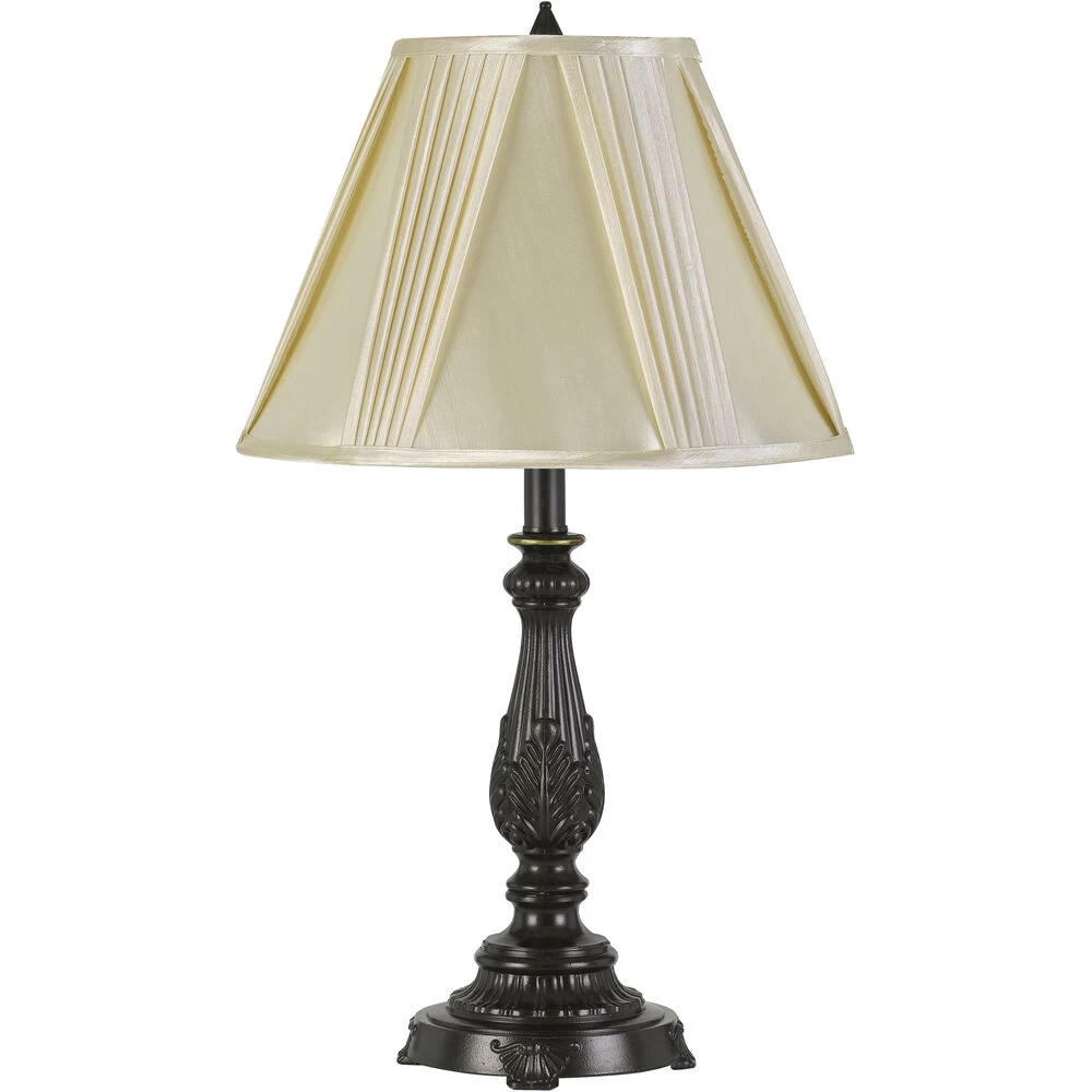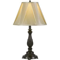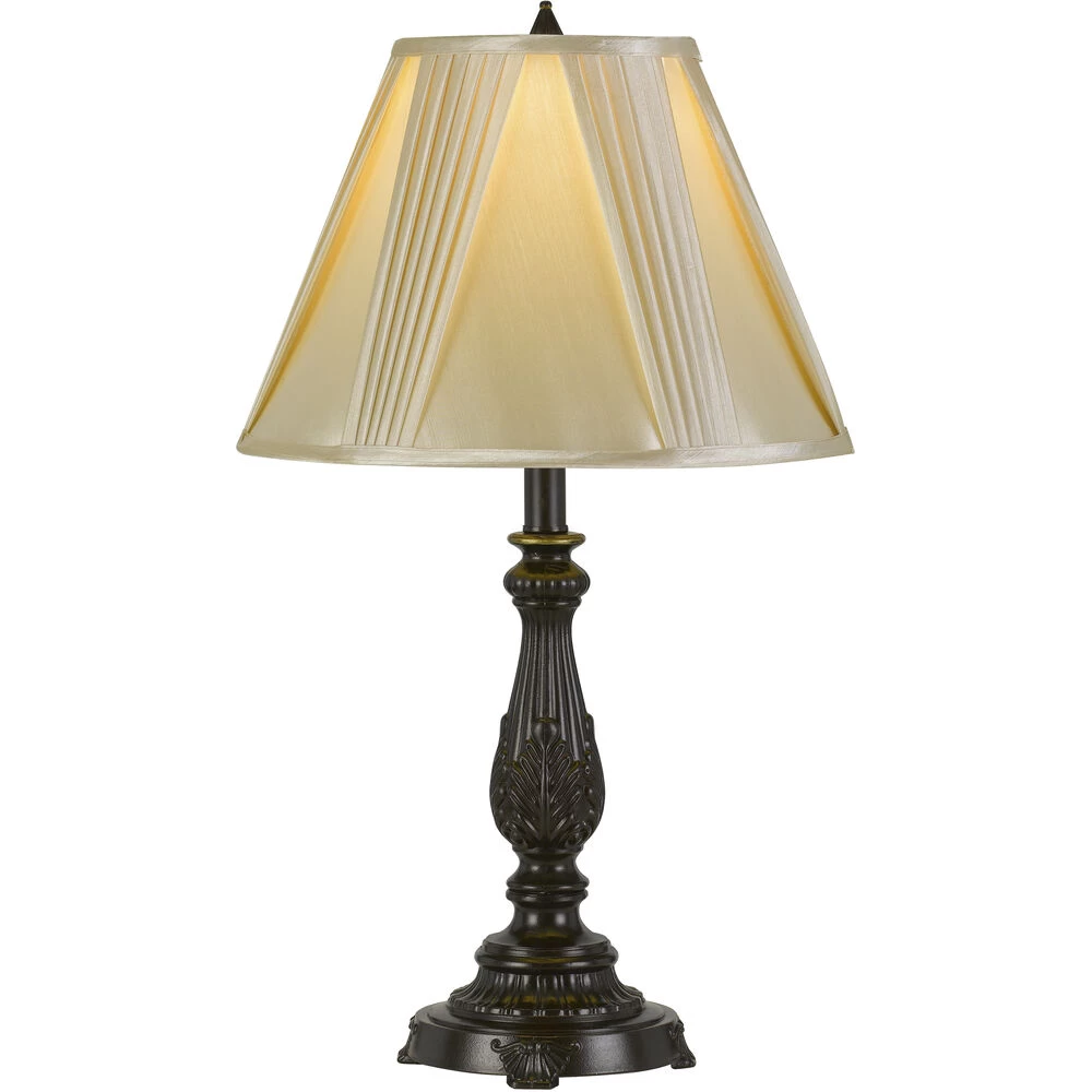Update your décor with this traditional inspired table lamp. It features a smooth dark bronze finish with leaf pattern touches. A shimmery pleated faux silk bell shade and pointed metal finial complete the look.