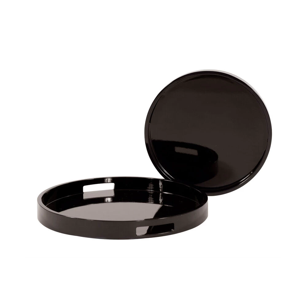 This tray set has an elegant round shape. The smooth wood is finished in a high gloss black lacquer. The simplicity of these trays allows them to fit right in with any decor style. From Contemporary, to Art Deco; from Transitional to a Scandinavian look, plus everything in between. The tray set includes one small and one large tray. Use them together or each on their own. Trays feature convenient cut out hand holds. Also available in White or Taupe.