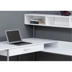 Let this L-shaped corner desk / workstation inspire you with its practical and modern industrial aesthetic. It starts with a smooth laminate finish on all sides in a chic fresh white finish accented with strong silver metal framing. The numerous storage options include a wide drawer on metal glides with a sturdy silver plastic handle alongside an open cubby, and two fixed bottom shelves for books, magazines or even a small printer. The side station is so useful with 3 spacious cubbies on top for all your work essentials. Assembly is required. Side station is not reversible.