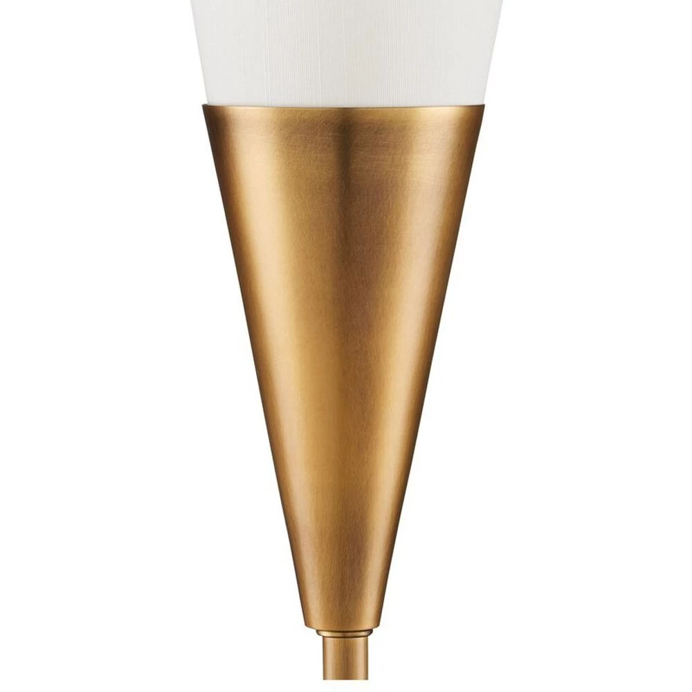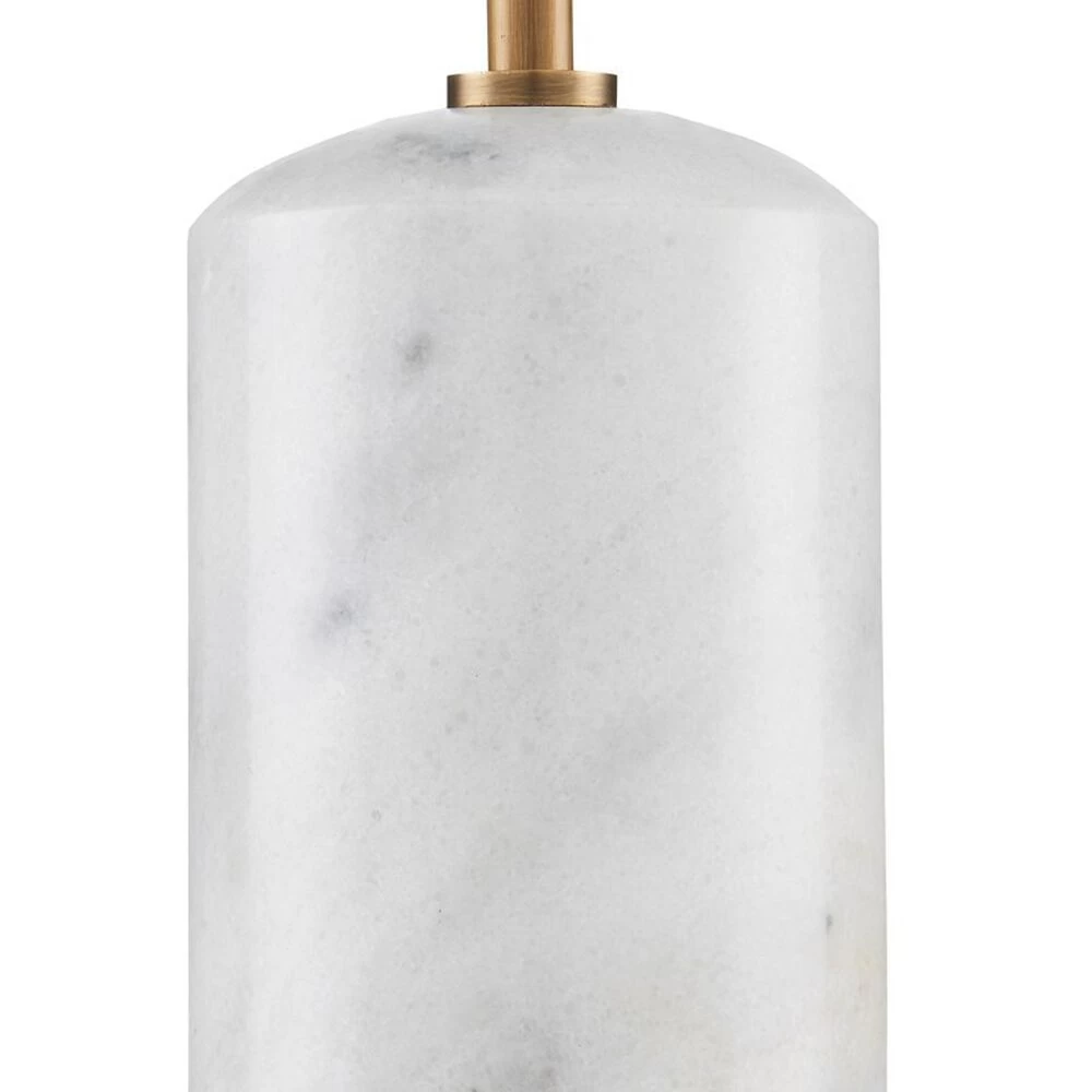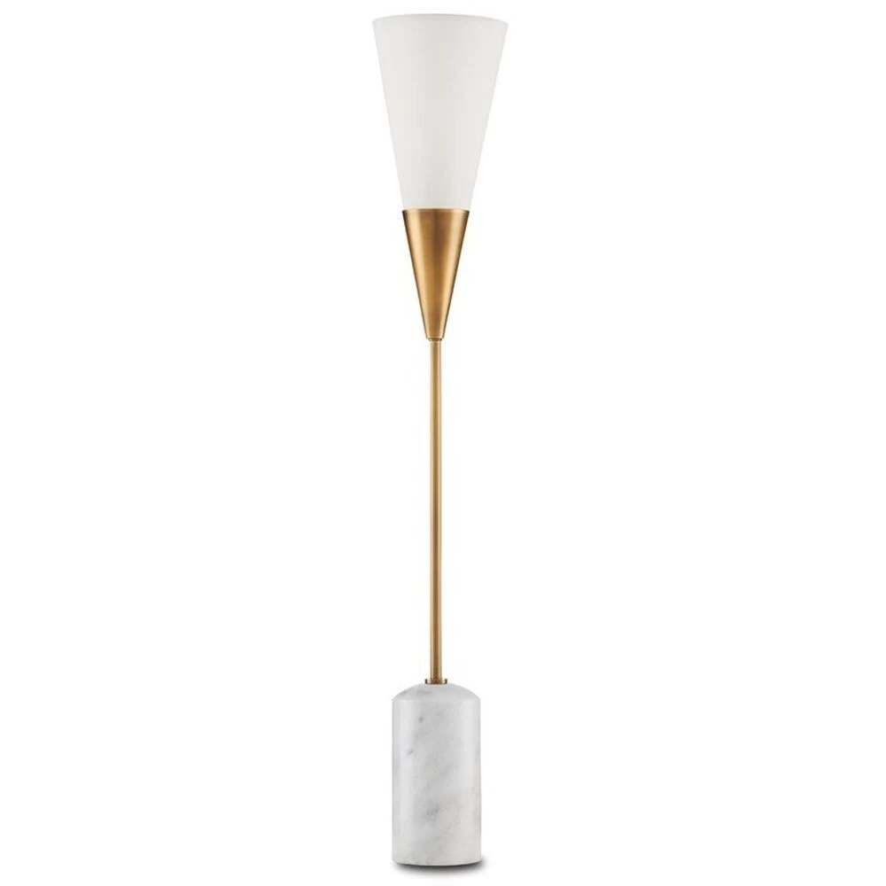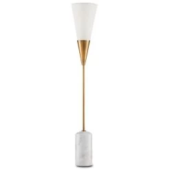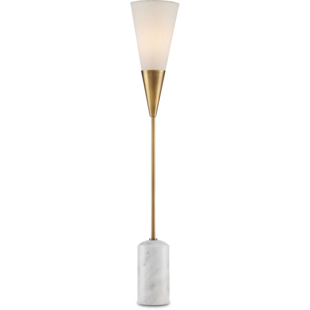 The Martini Torchiere Table Lamp was designed by Ian Thornton, whose inspiration was a martini glass that he stretched to form a narrower shape. He made the same move with the white marble base. The result is a chic gold and white table lamp with a cocktail of appealing attributes: the antique brass finish on the metal, which brings warmth to the design; and the off-white shantung shade that works in concert with the marble to lighten the composition are but two.