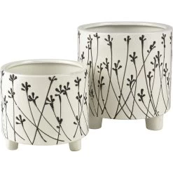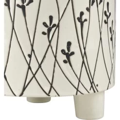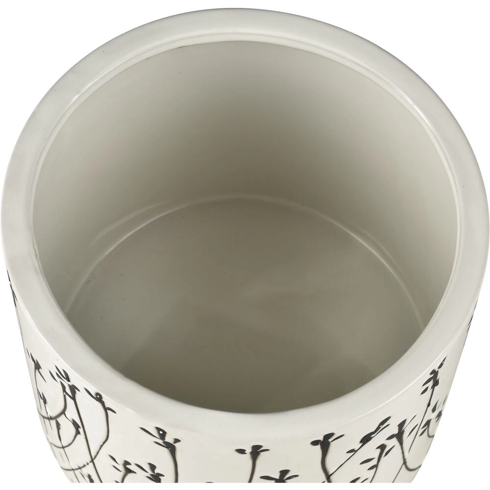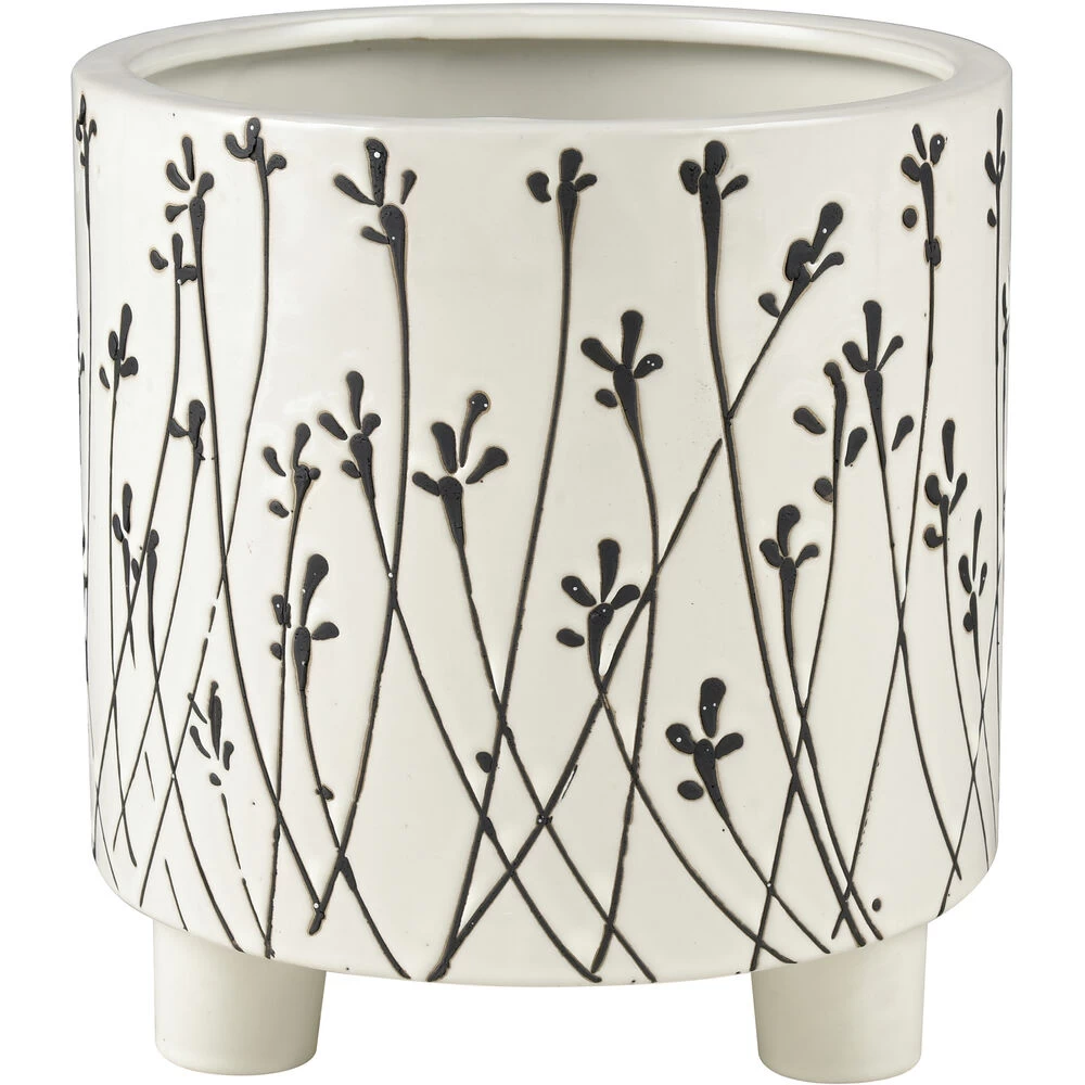 The Large Melton Planter features a rustic white glaze painted with stylized black stems, resembling a wind swept field of grass. The earthenware planter is ideal for displaying potted plants or trees in the home or on a covered patio area.