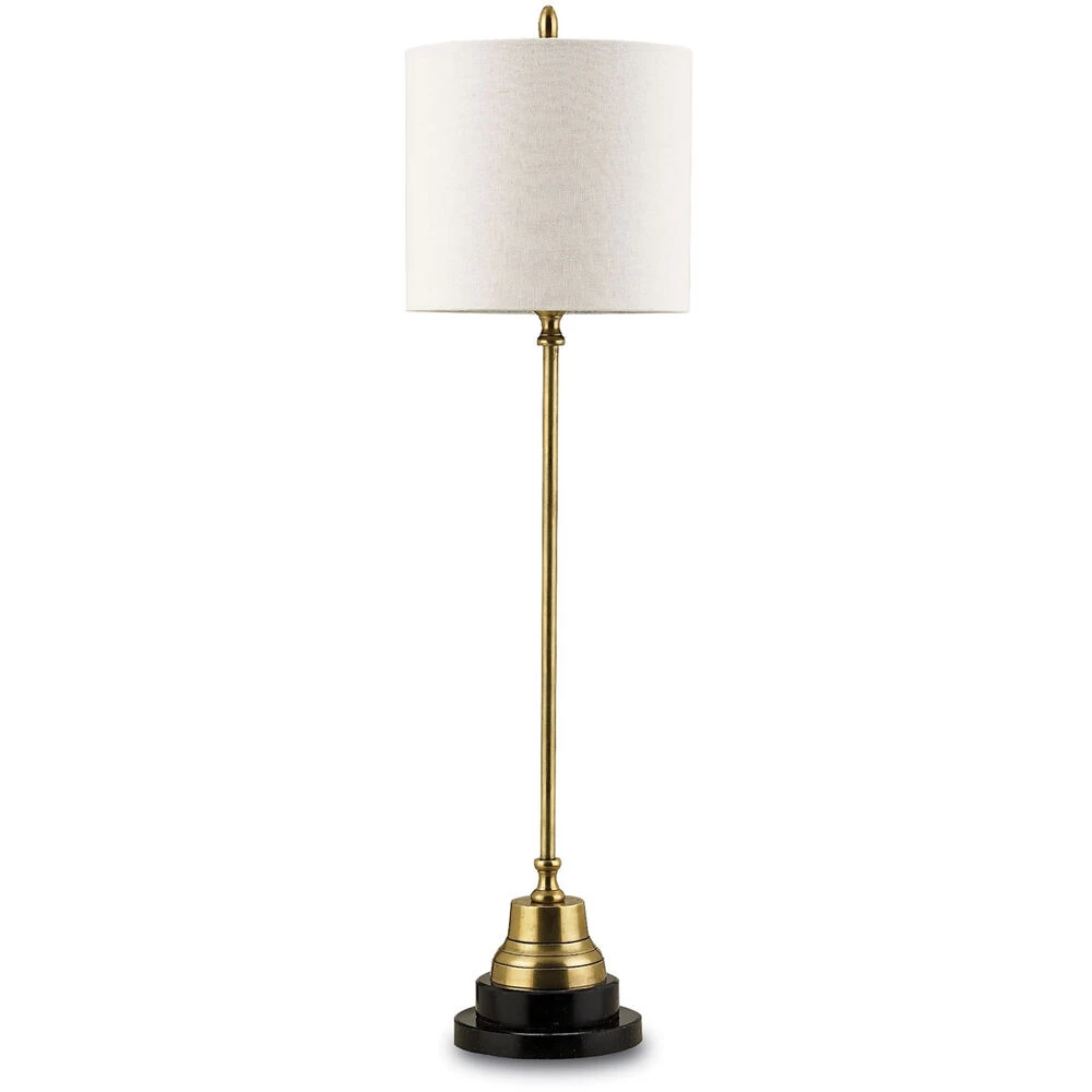 The enduring style of the solid cast Messenger Table Lamp is noteworthy thanks to a vintage brass finish on its slender stem, finial and fluted detail culminating upon a stacked black granite base. This classic piece looks at home in an array of interiors with its perfectly proportioned bone linen shade. The Messenger also comes in a cool nickel version of this warm design.