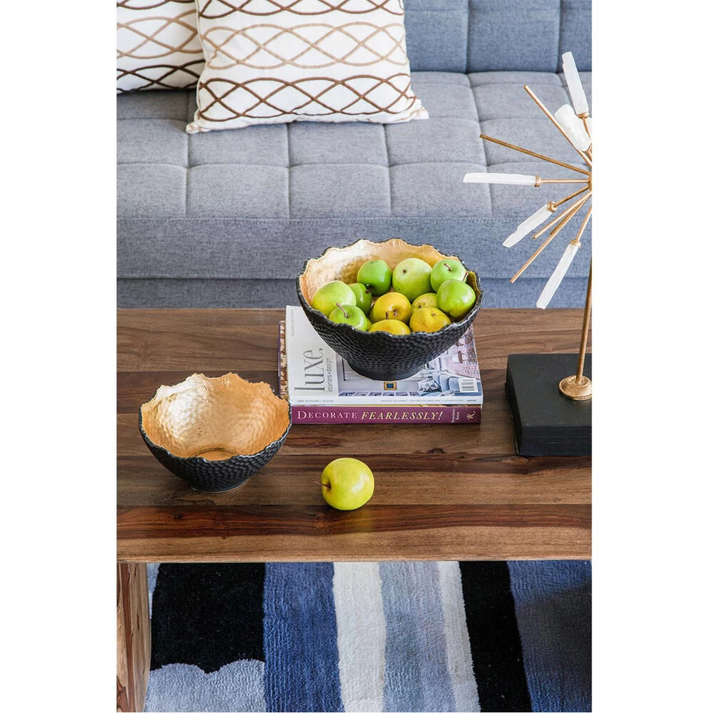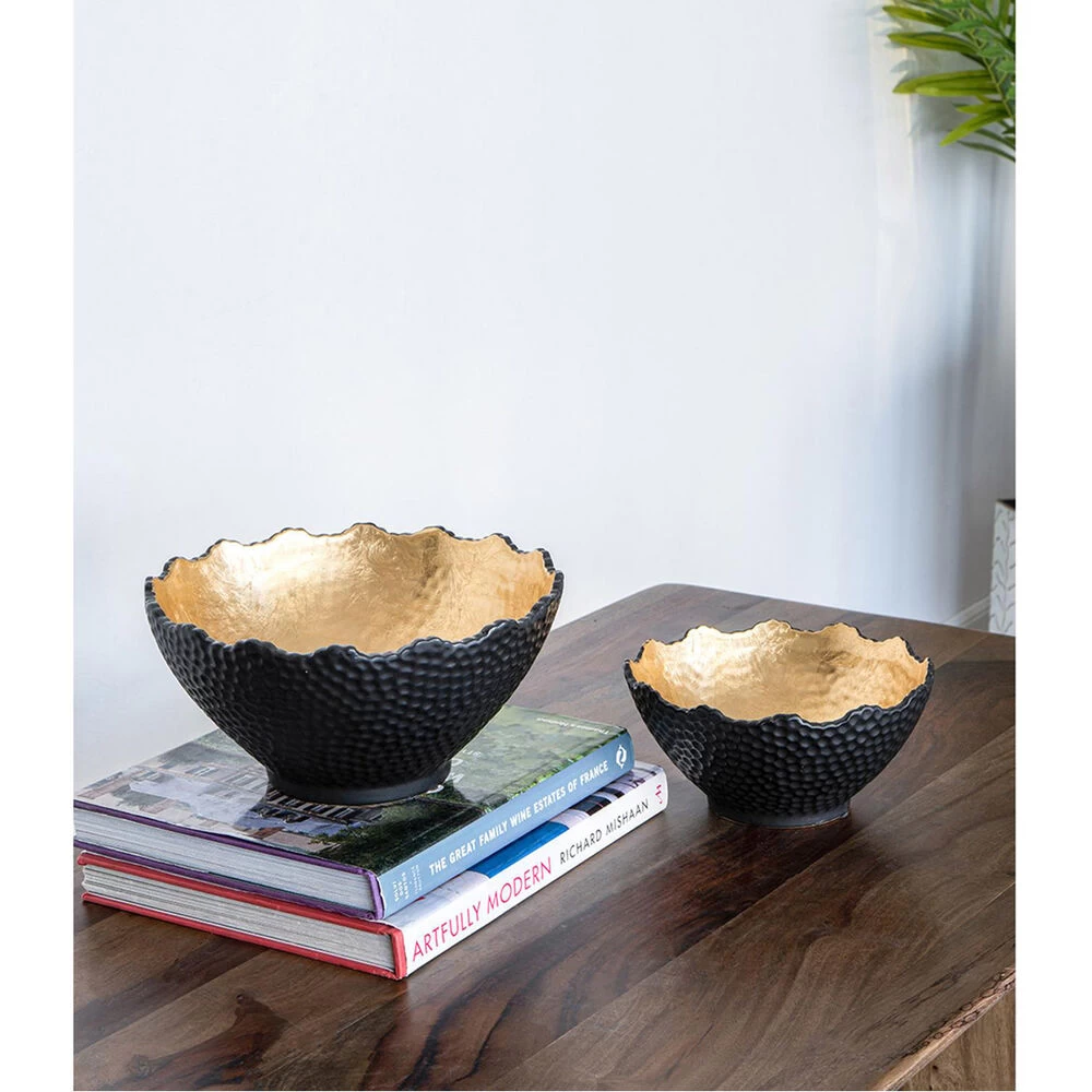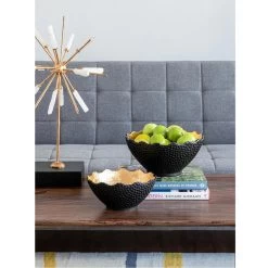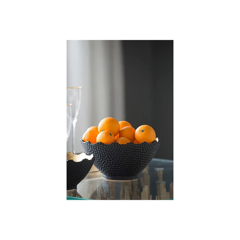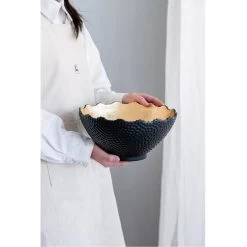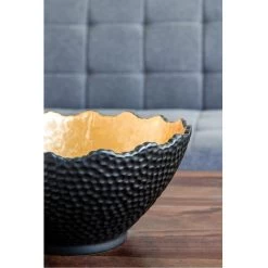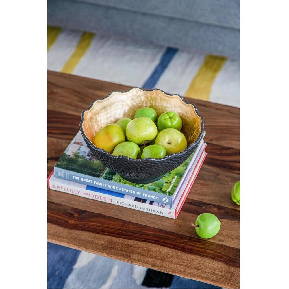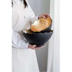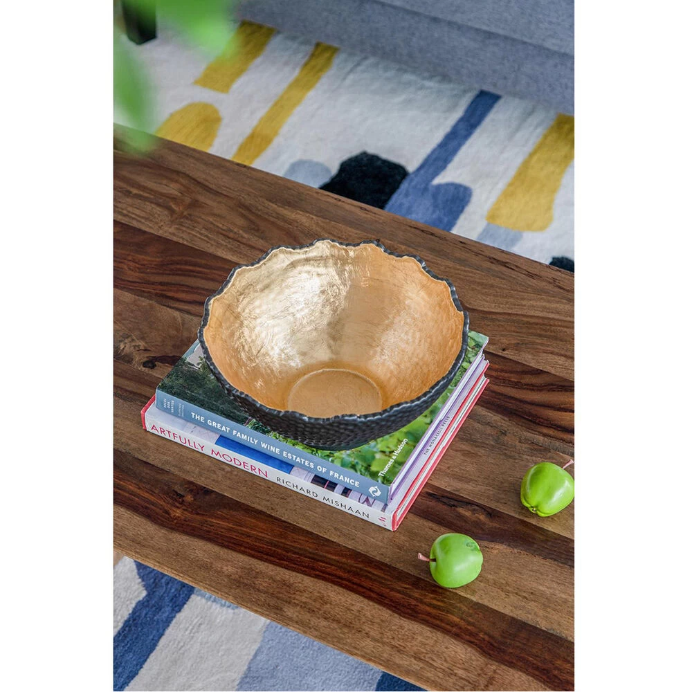 With its distinctive hand-hammered black finish and luminous gold interior, the large Metro Gilded Bowl makes a distinguished addition to the modern home or office. Pair with glowing candles for a radiantly luxurious effect. This piece shines brilliantly in a living room, kitchen, or chic office.